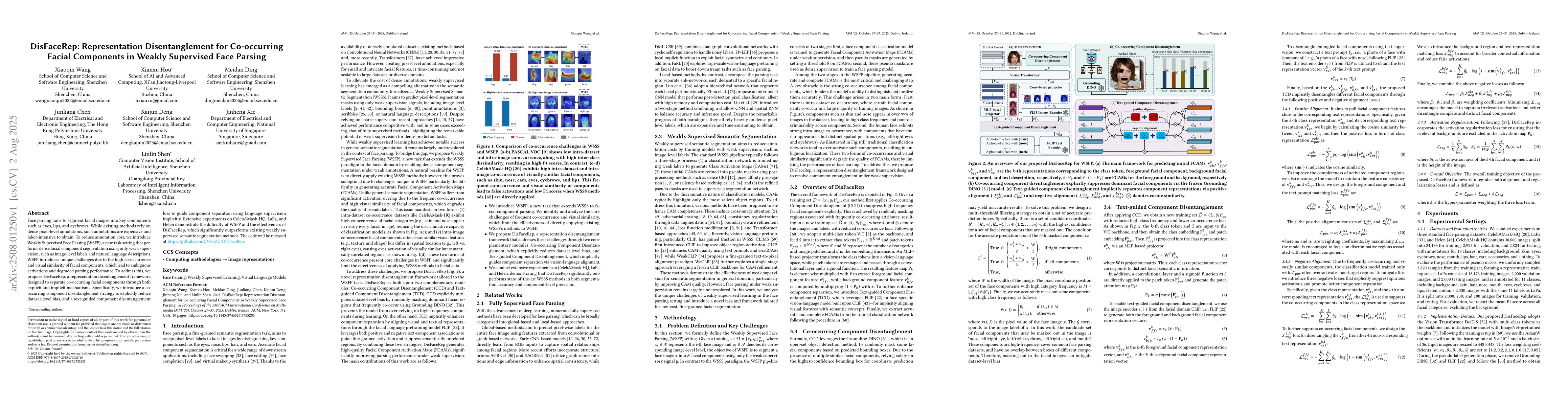 Face parsing aims to segment facial images into key components such as eyes, lips, and eyebrows. While existing methods rely on dense pixel-level annotations, such annotations are expensive and labor-intensive to obtain. To reduce annotation cost, we introduce Weakly Supervised Face Parsing (WSFP), a new task setting that performs dense facial component segmentation using only weak supervision, such as image-level labels and natural language descriptions. WSFP introduces unique challenges due to the high co-occurrence and visual similarity of facial components, which lead to ambiguous activations and degraded parsing performance. To address this, we propose DisFaceRep, a representation disentanglement framework designed to separate co-occurring facial components through both explicit and implicit mechanisms. Specifically, we introduce a co-occurring component disentanglement strategy to explicitly reduce dataset-level bias, and a text-guided component disentanglement loss to guide component separation using language supervision implicitly. Extensive experiments on CelebAMask-HQ, LaPa, and Helen demonstrate the difficulty of WSFP and the effectiveness of DisFaceRep, which significantly outperforms existing weakly supervised semantic segmentation methods. The code will be released at \href{https://github.com/CVI-SZU/DisFaceRep}{\textcolor{cyan}{https://github.com/CVI-SZU/DisFaceRep}}.