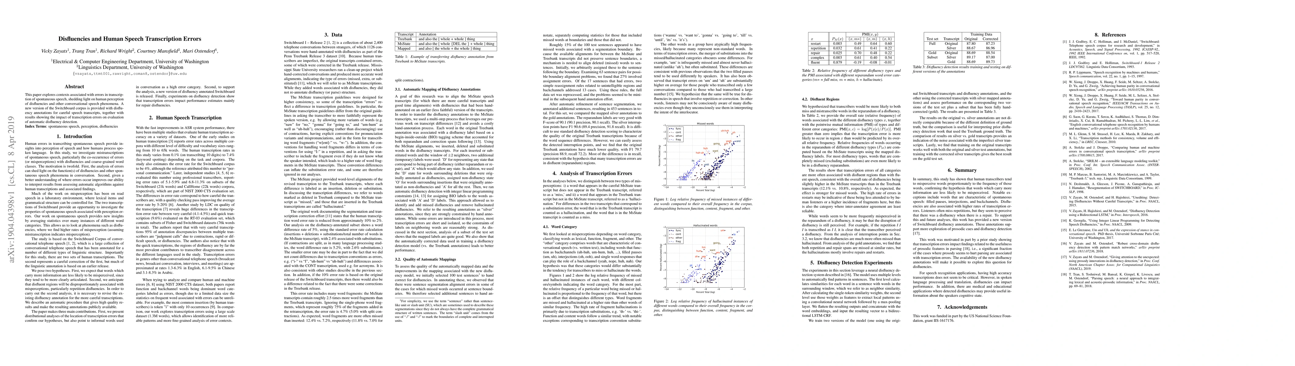 This paper explores contexts associated with errors in transcrip-tion of spontaneous speech, shedding light on human perceptionof disfluencies and other conversational speech phenomena. Anew version of the Switchboard corpus is provided with disfluency annotations for careful speech transcripts, together with results showing the impact of transcription errors on evaluation of automatic disfluency detection.