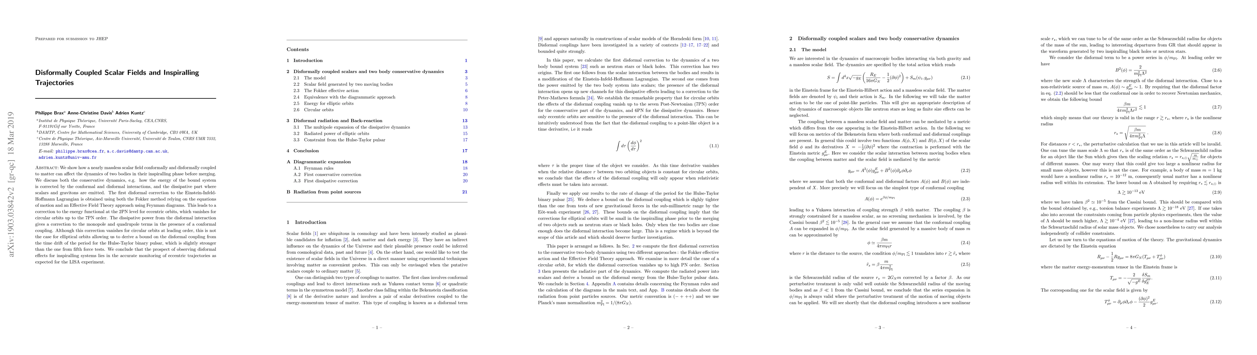 This paper investigates how a nearly massless scalar field, conformally and disformally coupled to matter, influences the dynamics of inspiralling binary systems. It derives corrections to the Einstein-Infeld-Hoffmann Lagrangian and finds that disformal interactions can affect both the conservative and dissipative dynamics, particularly for elliptical orbits, providing a tighter bound on disformal coupling constants than fifth force tests.