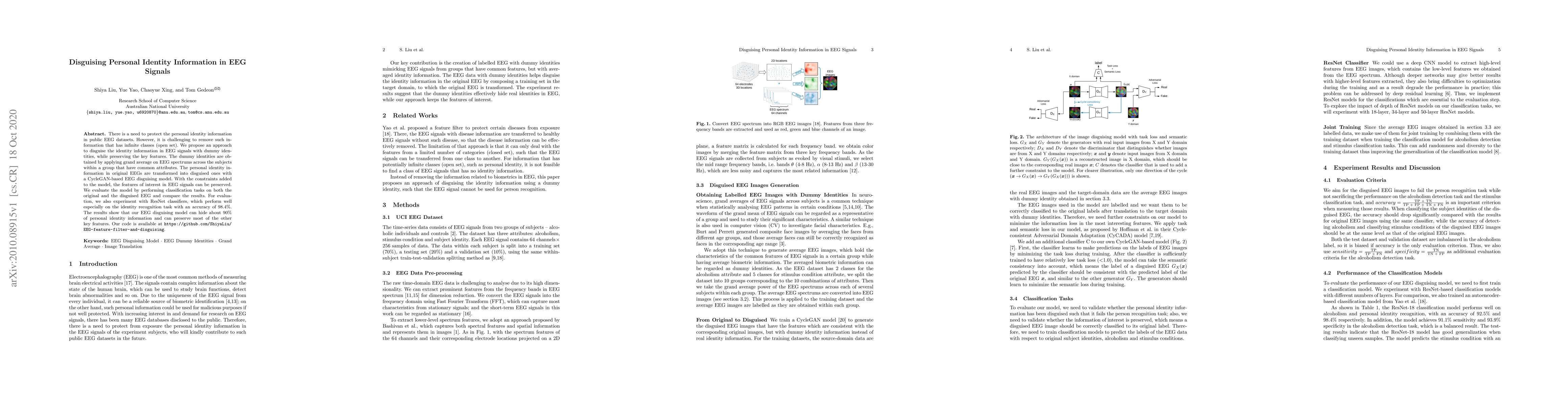 This paper proposes a method to disguise personal identity information in EEG signals using dummy identities generated from grand average EEG spectrums, while preserving key features. The CycleGAN-based model transforms original EEGs into disguised versions, and evaluation shows it can hide 90% of identity information while maintaining classification accuracy.