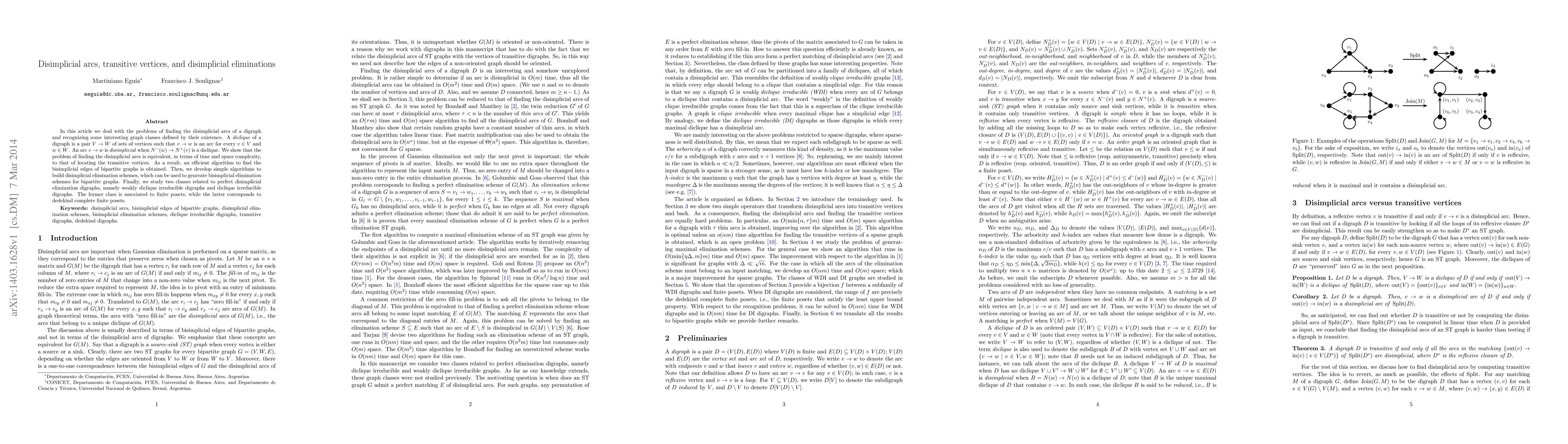 In this article we deal with the problems of finding the disimplicial arcs of a digraph and recognizing some interesting graph classes defined by their existence. A diclique of a digraph is a pair $V \to W$ of sets of vertices such that $v \to w$ is an arc for every $v \in V$ and $w \in W$. An arc $v \to w$ is disimplicial when $N^-(w) \to N^+(v)$ is a diclique. We show that the problem of finding the disimplicial arcs is equivalent, in terms of time and space complexity, to that of locating the transitive vertices. As a result, an efficient algorithm to find the bisimplicial edges of bipartite graphs is obtained. Then, we develop simple algorithms to build disimplicial elimination schemes, which can be used to generate bisimplicial elimination schemes for bipartite graphs. Finally, we study two classes related to perfect disimplicial elimination digraphs, namely weakly diclique irreducible digraphs and diclique irreducible digraphs. The former class is associated to finite posets, while the latter corresponds to dedekind complete finite posets.