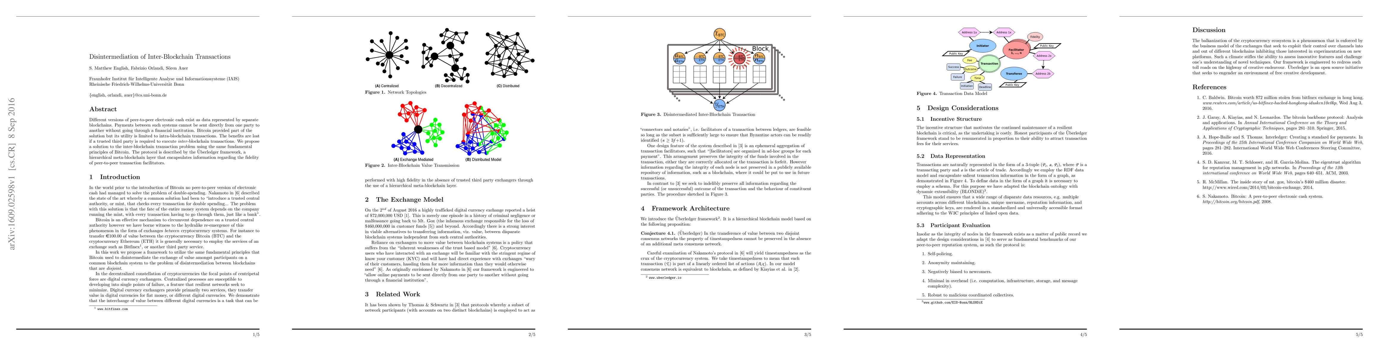 This paper addresses the challenge of disintermediating inter-blockchain transactions by proposing the Uberledger framework, a hierarchical meta-blockchain layer that enhances direct peer-to-peer transaction fidelity without requiring a trusted third party. The solution aims to maintain the decentralized benefits of Bitcoin while facilitating cross-blockchain payments.
