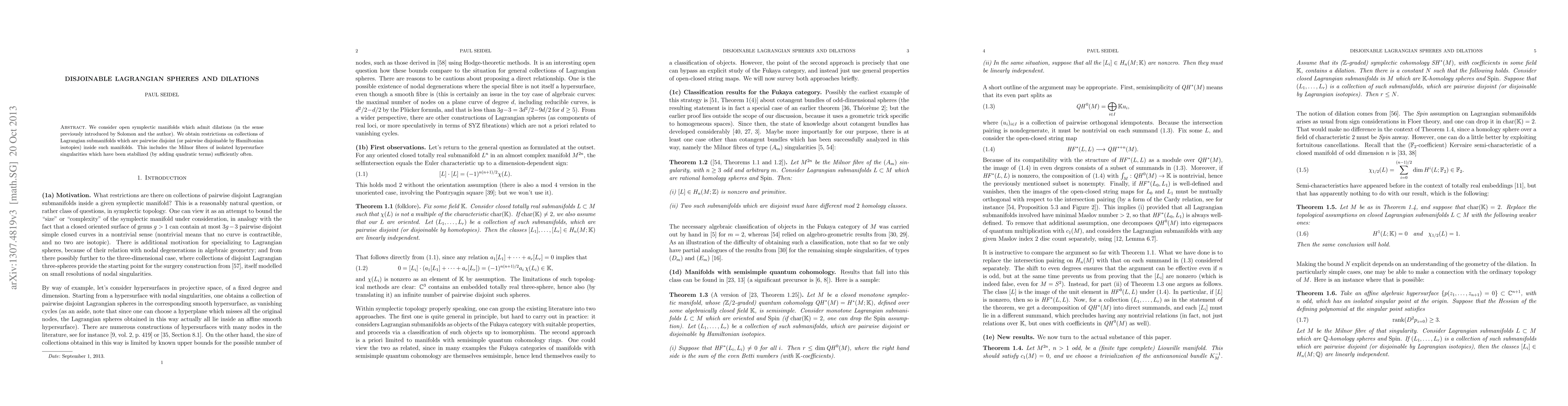 This paper studies open symplectic manifolds with dilations, deriving constraints on collections of Lagrangian submanifolds that can be pairwise disjoint or disjoinable via Hamiltonian isotopies, particularly focusing on stabilized Milnor fibres of isolated hypersurface singularities.