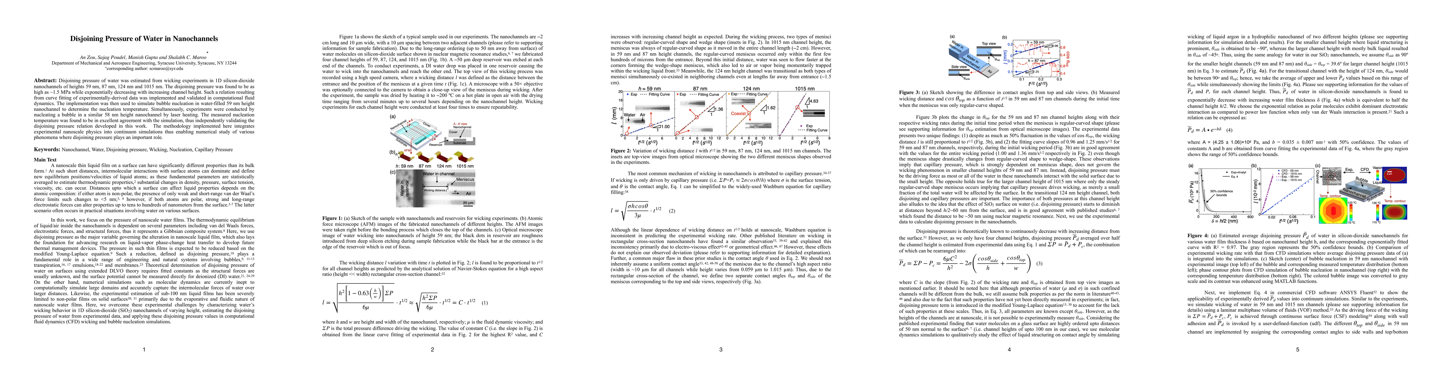 This paper investigates water wicking in silicon-dioxide nanochannels to estimate the disjoining pressure of water, finding it to be as high as ~1.5 MPa in smaller channels. The pressure decreases exponentially with channel height, and this relationship is validated in computational fluid dynamics, integrating nanoscale physics into continuum simulations.