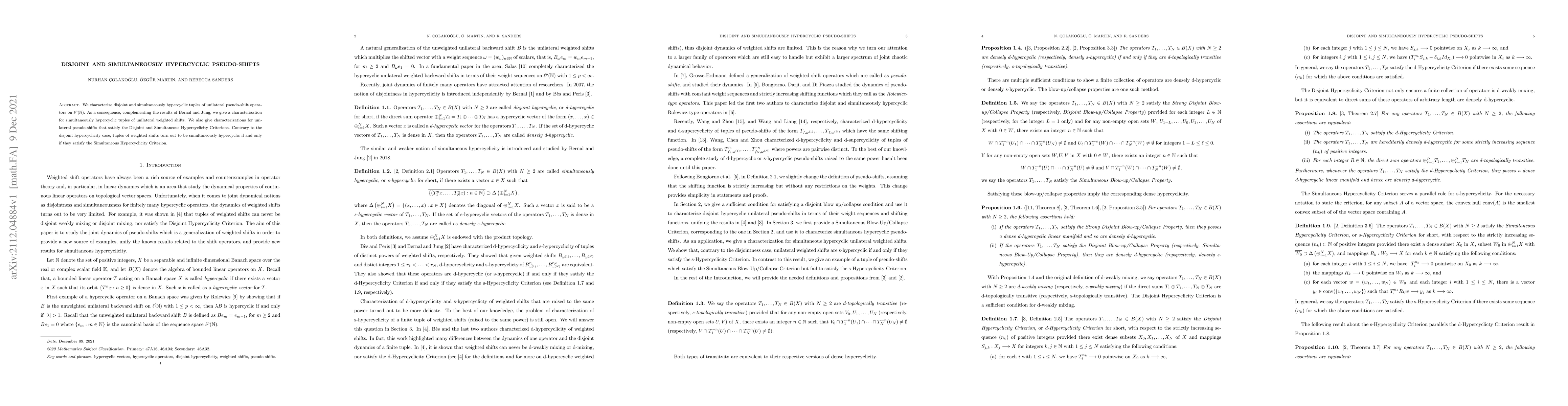 The paper characterizes disjoint and simultaneously hypercyclic tuples of unilateral pseudo-shift operators on $\ell^p(\mathbb{N})$, extending previous results for weighted shifts. It concludes that simultaneous hypercyclicity of weighted shifts precisely follows the Simultaneous Hypercyclicity Criterion.