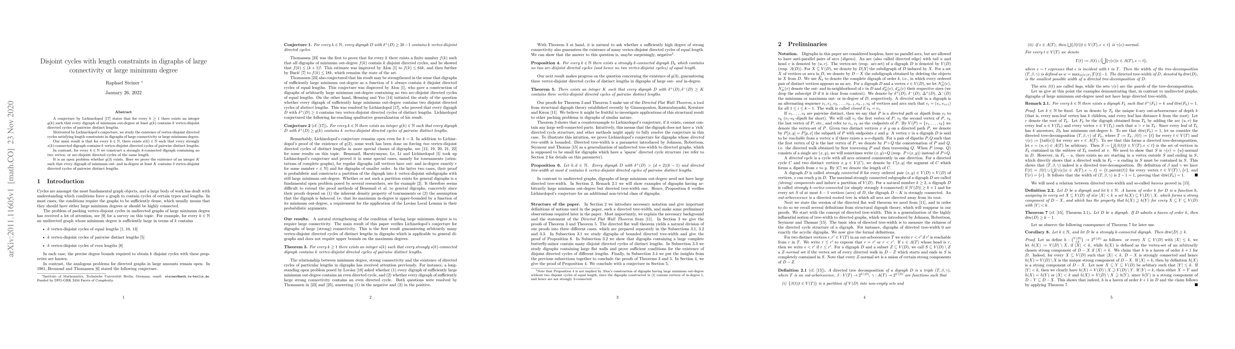 A conjecture by Lichiardopol states that for every $k \ge 1$ there exists an integer $g(k)$ such that every digraph of minimum out-degree at least $g(k)$ contains $k$ vertex-disjoint directed cycles of pairwise distinct lengths. Motivated by Lichiardopol's conjecture, we study the existence of vertex-disjoint directed cycles satisfying length constraints in digraphs of large connectivity or large minimum degree. Our main result is that for every $k \in \mathbb{N}$, there exists $s(k) \in \mathbb{N}$ such that every strongly $s(k)$-connected digraph contains $k$ vertex-disjoint directed cycles of pairwise distinct lengths. In contrast, for every $k \in \mathbb{N}$ we construct a strongly $k$-connected digraph containing no two vertex- or arc-disjoint directed cycles of the same length. It is an open problem whether $g(3)$ exists. Here we prove the existence of an integer $K$ such that every digraph of minimum out- and in-degree at least $K$ contains $3$ vertex-disjoint directed cycles of pairwise distinct lengths.