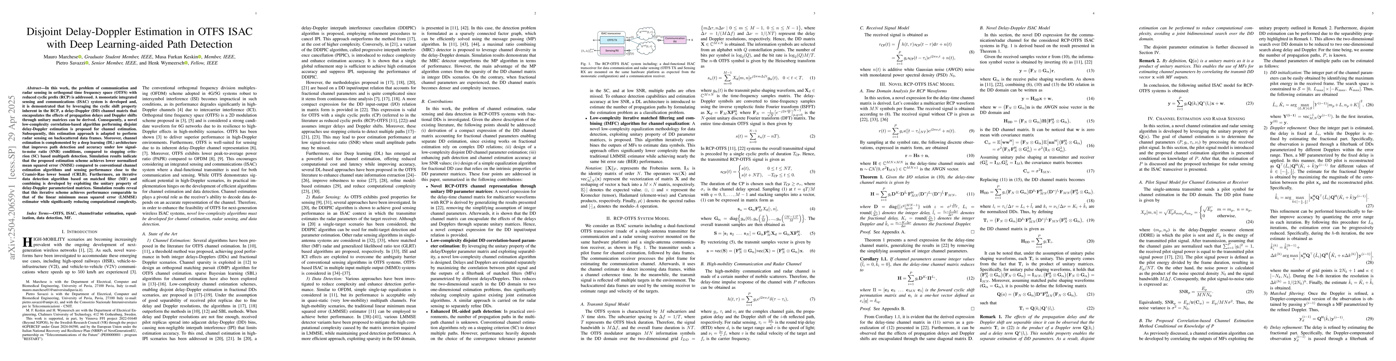 The main technical contribution lies in the development of a disjoint delay-Doppler estimation algorithm for OTFS-based ISAC systems, complemented by a deep learning architecture for path detection, and an iterative data detection scheme with reduced complexity.
