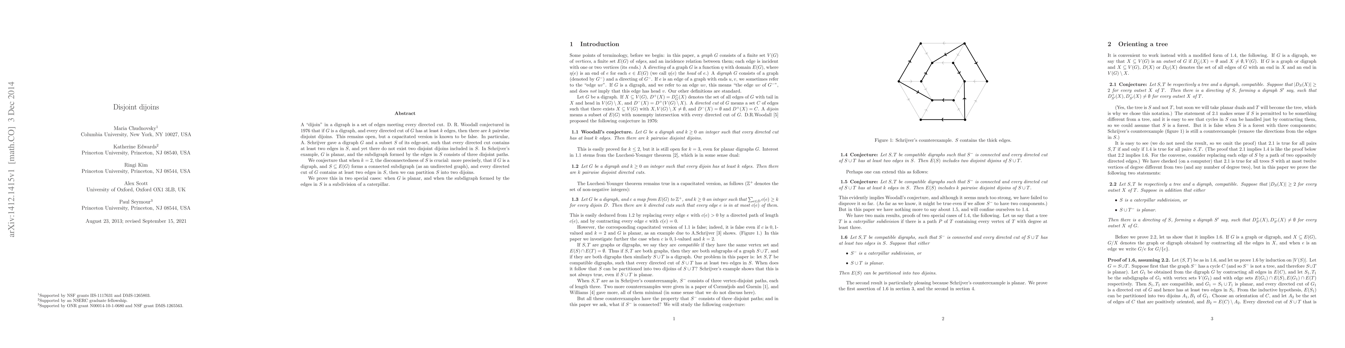 Researchers have conjectured that in a digraph, if every directed cut has at least two edges from a connected subset S, it can be partitioned into two disjoint dijoins, disproving a counterexample for k=2.