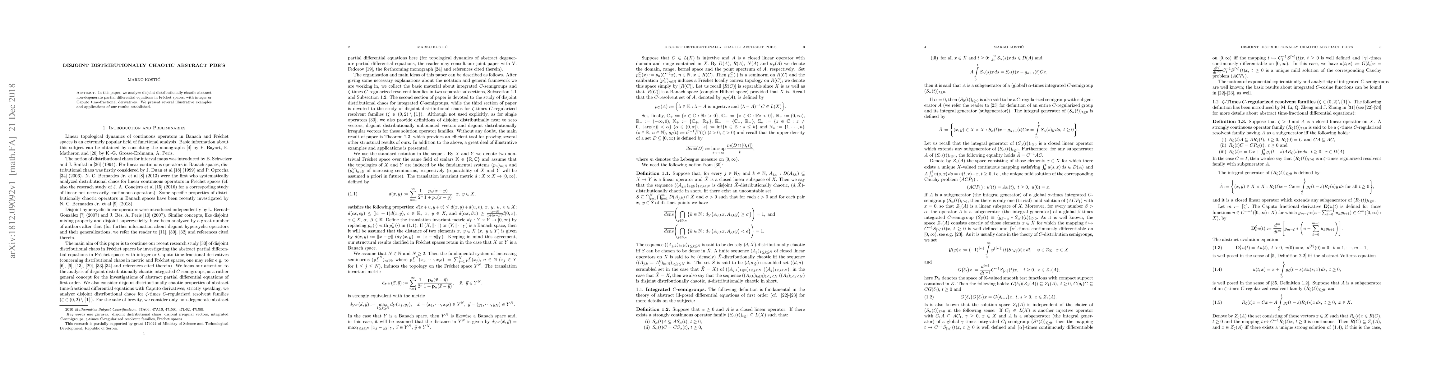In this paper, we analyze disjoint distributionally chaotic abstract non-degenerate partial differential equations in Fr\' echet spaces, with integer or Caputo time-fractional derivatives. We present several illustrative examples and applications of our results established.