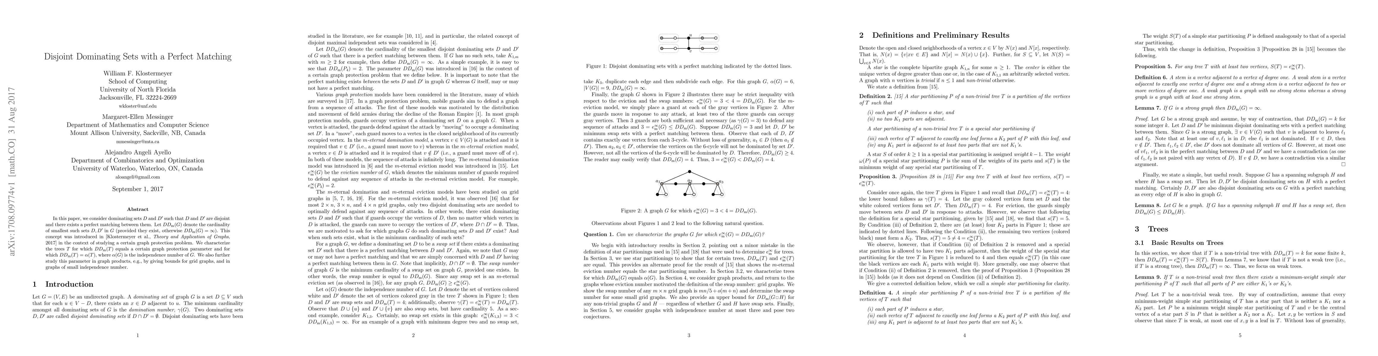 In this paper, we consider dominating sets $D$ and $D'$ such that $D$ and $D'$ are disjoint and there exists a perfect matching between them. Let $DD_{\textrm{m}}(G)$ denote the cardinality of smallest such sets $D, D'$ in $G$ (provided they exist, otherwise $DD_{\textrm{m}}(G) = \infty$). This concept was introduced in [Klostermeyer et al., Theory and Application of Graphs, 2017] in the context of studying a certain graph protection problem. We characterize the trees $T$ for which $DD_{\textrm{m}}(T)$ equals a certain graph protection parameter and for which $DD_{\textrm{m}}(T) = \alpha(T)$, where $\alpha(G)$ is the independence number of $G$. We also further study this parameter in graph products, e.g., by giving bounds for grid graphs, and in graphs of small independence number.