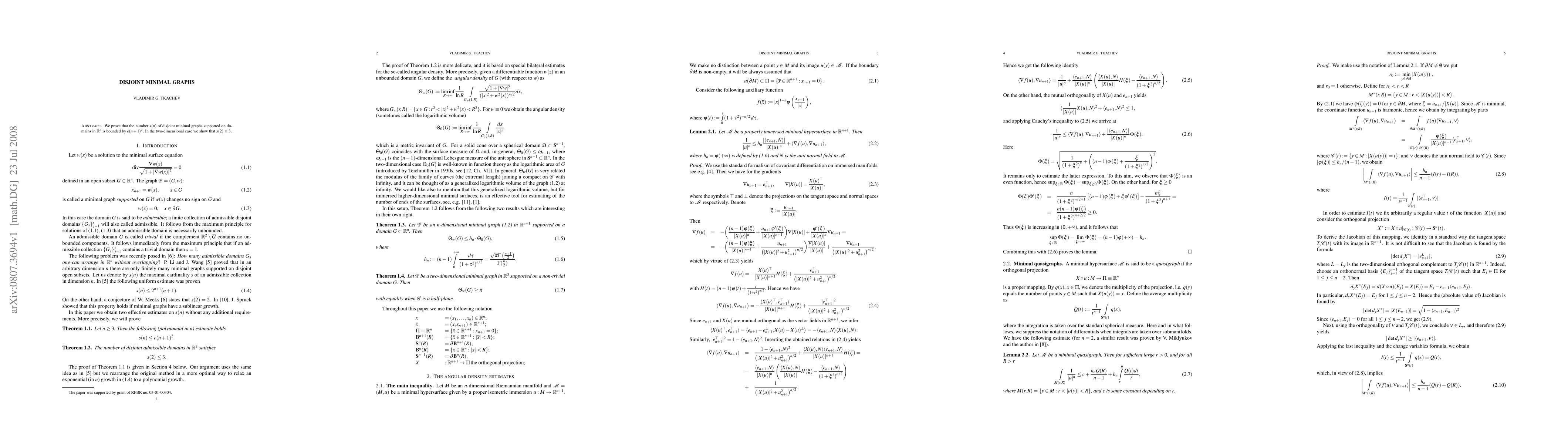 Researchers prove that the number of disjoint minimal graphs in R^n is bounded by e(n+1)^2, resolving a conjecture in the two-dimensional case with a maximum of three graphs.