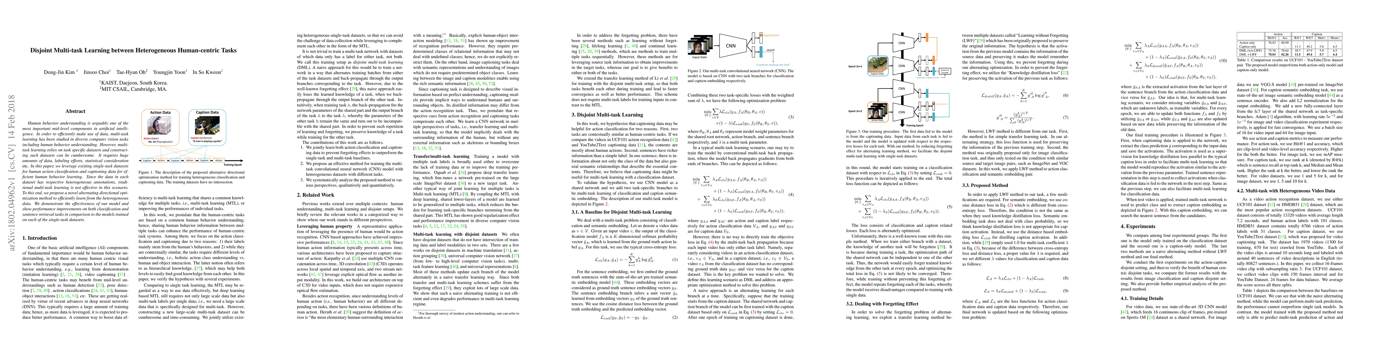 This paper proposes a novel alternating directional optimization method for disjoint multi-task learning to efficiently utilize heterogeneous human-centric datasets for human action classification and captioning. The method demonstrates improved performance over single-task models on both classification and sentence retrieval tasks.