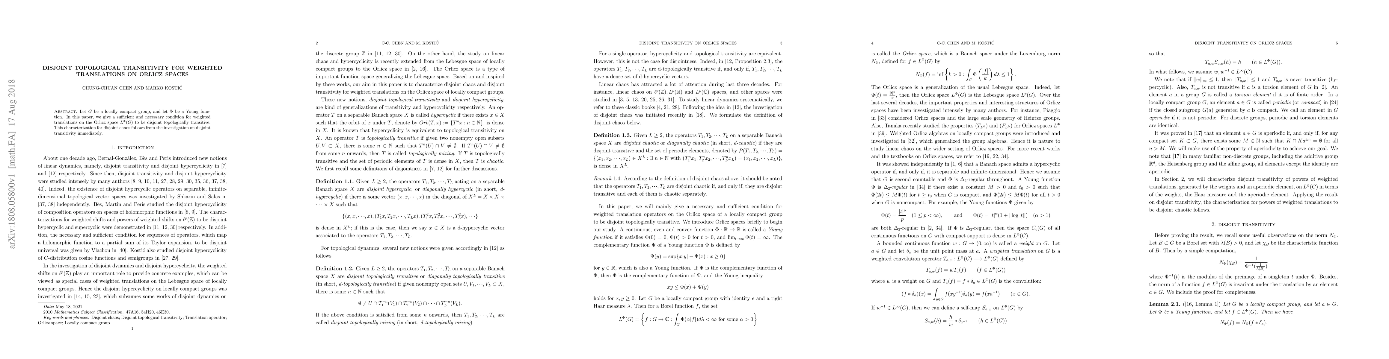 This paper establishes a characterization for weighted translations on Orlicz spaces to be disjoint topologically transitive, focusing on locally compact groups and Young functions.