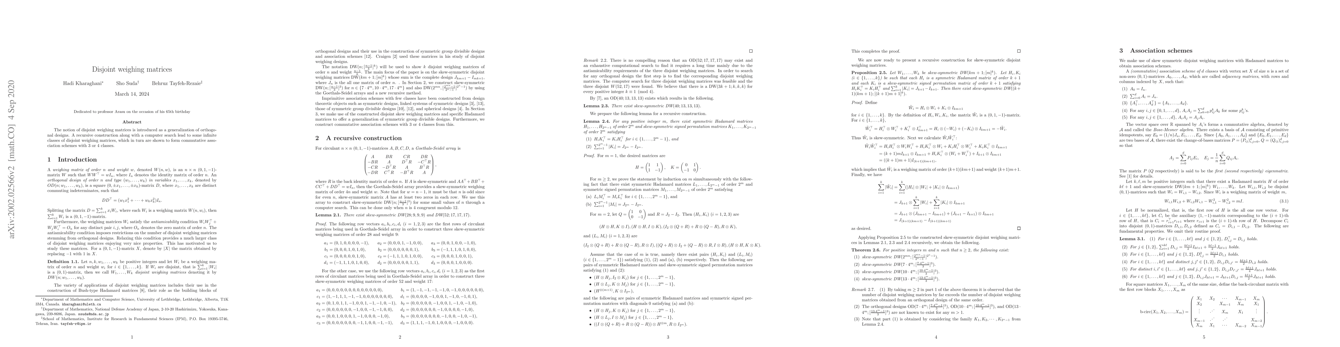 Summary: Disjoint weighing matrices generalize orthogonal designs and are constructed recursively with computer assistance, forming infinite classes that create commutative association schemes with either 3 or 4 classes.