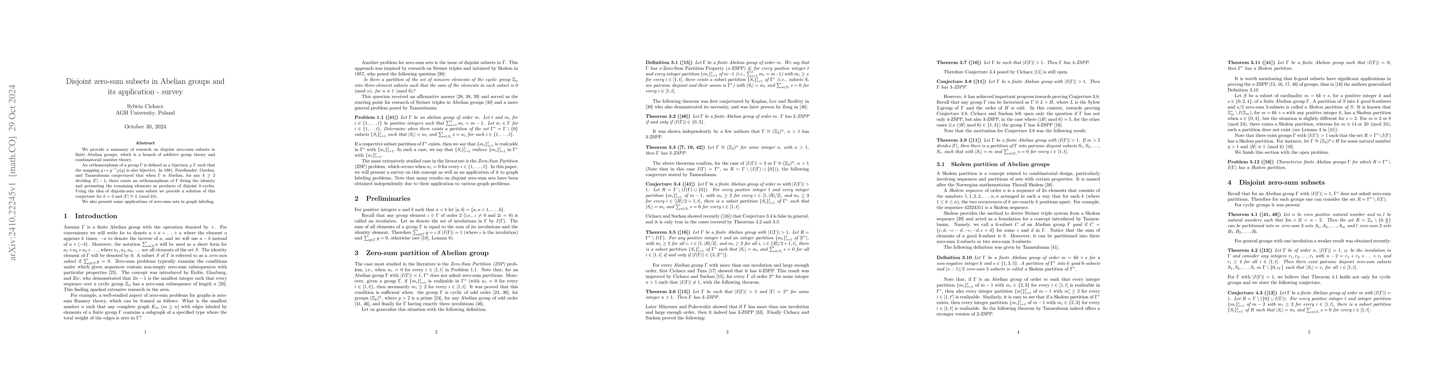 We provide a summary of research on disjoint zero-sum subsets in finite Abelian groups, which is a branch of additive group theory and combinatorial number theory. An orthomorphism of a group $\Gamma$ is defined as a bijection $\varphi$ $\Gamma$ such that the mapping $g \mapsto g^{-1}\varphi(g)$ is also bijective. In 1981, Friedlander, Gordon, and Tannenbaum conjectured that when $\Gamma$ is Abelian, for any $k \geq 2$ dividing $|\Gamma| -1$, there exists an orthomorphism of $\Gamma$ fixing the identity and permuting the remaining elements as products of disjoint $k$-cycles. Using the idea of disjoint-zero sum subset we provide a solution of this conjecture for $k=3$ and $|\Gamma|\cong 4\pmod{24}$. We also present some applications of zero-sum sets in graph labeling.