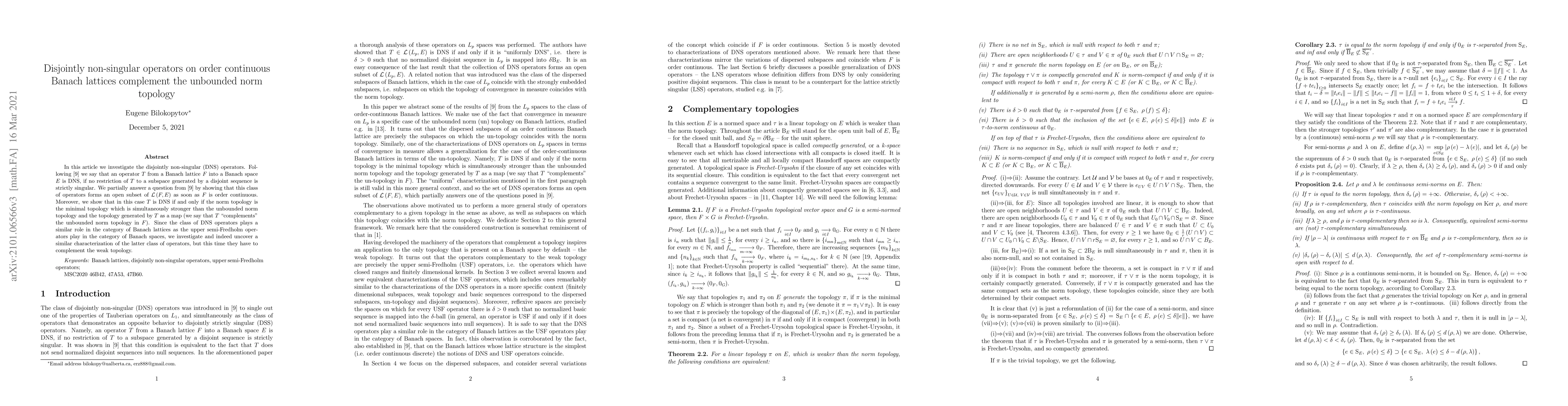 In this article we investigate the disjointly non-singular (DNS) operators. Following [8] we say that an operator $T$ from a Banach lattice $F$ into a Banach space $E$ is DNS, if no restriction of $T$ to a subspace generated by a disjoint sequence is strictly singular. We partially answer a question from [8] by showing that this class of operators forms an open subset of $L\left(F,E\right)$ as soon as $F$ is order continuous. Moreover, we show that in this case $T$ is DNS if and only if the norm topology is the minimal topology which is simultaneously stronger than the unbounded norm topology and the topology generated by $T$ as a map (we say that $T$ "complements" the unbounded norm topology in $F$). Since the class of DNS operators plays a similar role in the category of Banach lattices as the upper semi-Fredholm operators play in the category of Banach spaces, we investigate and indeed uncover a similar characterization of the latter class of operators, but this time they have to complement the weak topology.