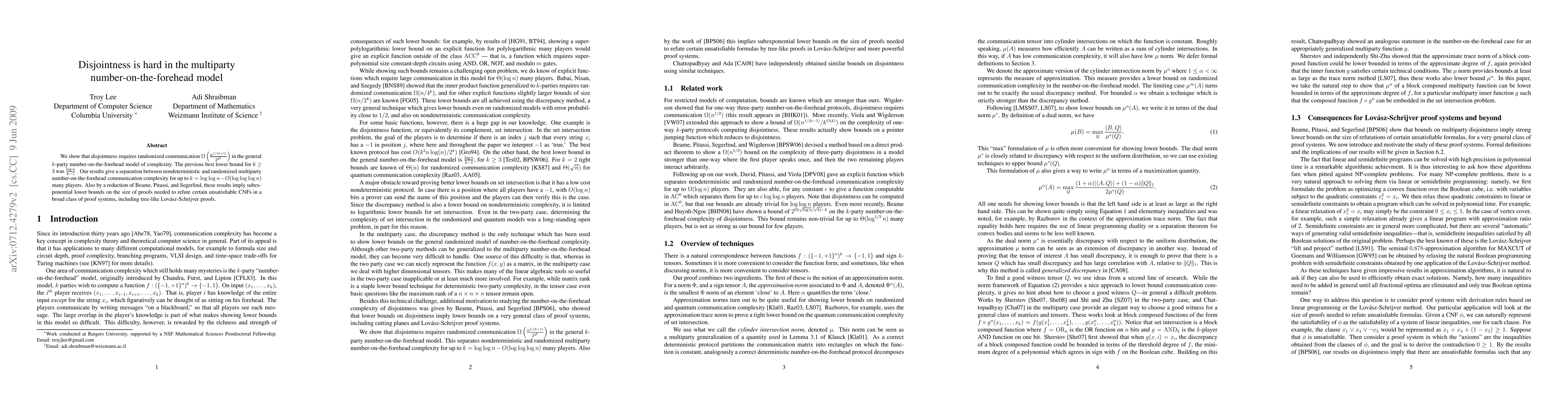 We show that disjointness requires randomized communication Omega(n^{1/(k+1)}/2^{2^k}) in the general k-party number-on-the-forehead model of complexity. The previous best lower bound for k >= 3 was log(n)/(k-1). Our results give a separation between nondeterministic and randomized multiparty number-on-the-forehead communication complexity for up to k=log log n - O(log log log n) many players. Also by a reduction of Beame, Pitassi, and Segerlind, these results imply subexponential lower bounds on the size of proofs needed to refute certain unsatisfiable CNFs in a broad class of proof systems, including tree-like Lovasz-Schrijver proofs.