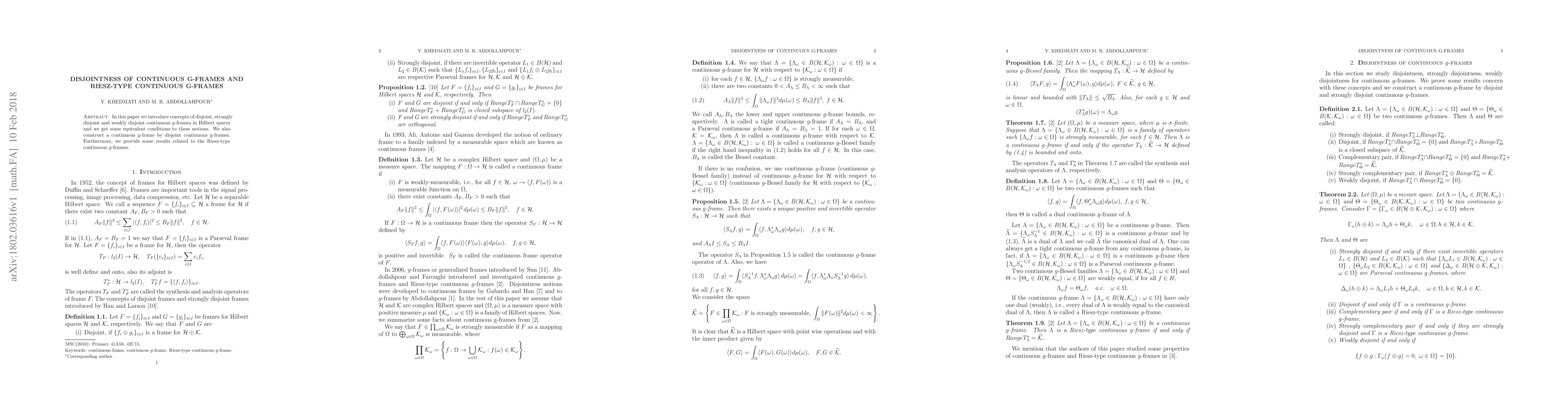 This paper introduces concepts of disjoint, strongly disjoint, and weakly disjoint continuous $g$-frames in Hilbert spaces, providing equivalent conditions for these notions. It also constructs a continuous $g$-frame from disjoint continuous $g$-frames and discusses results related to Riesz-type continuous $g$-frames.