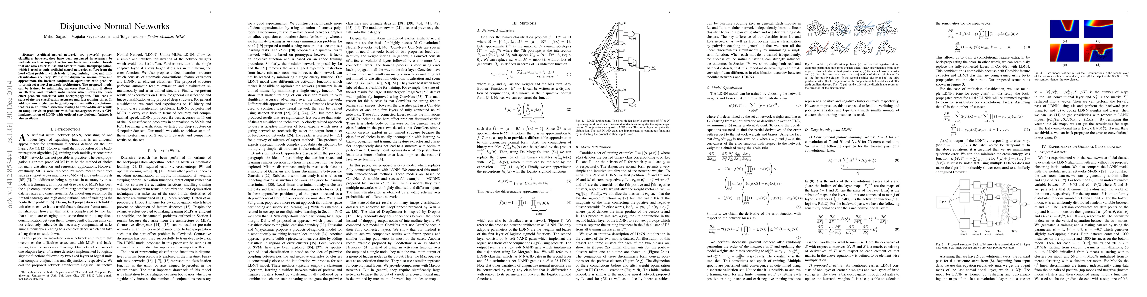 The paper proposes Disjunctive Normal Networks (LDNN), a novel neural network architecture that addresses the herd effect problem in traditional backpropagation training, leading to faster training times and improved accuracy. The model is trained by minimizing an error function and allows for an intuitive initialization, which is contrasted with modular neural networks and support vector machines.