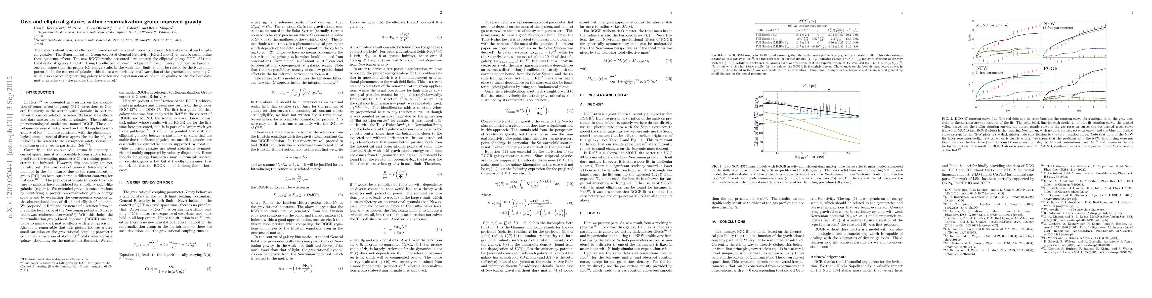 The paper is about possible effects of infrared quantum contributions to General Relativity on disk and elliptical galaxies. The Renormalization Group corrected General Relativity (RGGR model) is used to parametrize these quantum effects. The new RGGR results presented here concern the elliptical galaxy NGC 4374 and the dwarf disk galaxy DDO 47. Using the effective approach to Quantum Field Theory in curved background, one can argue that the proper RG energy scale, in the weak field limit, should be related to the Newtonian potential. In the context of galaxies, this led to a remarkably small variation of the gravitational coupling G, while also capable of generating galaxy rotation and dispersion curves of similar quality to the the best dark matter profiles (i.e., the profiles that have a core).