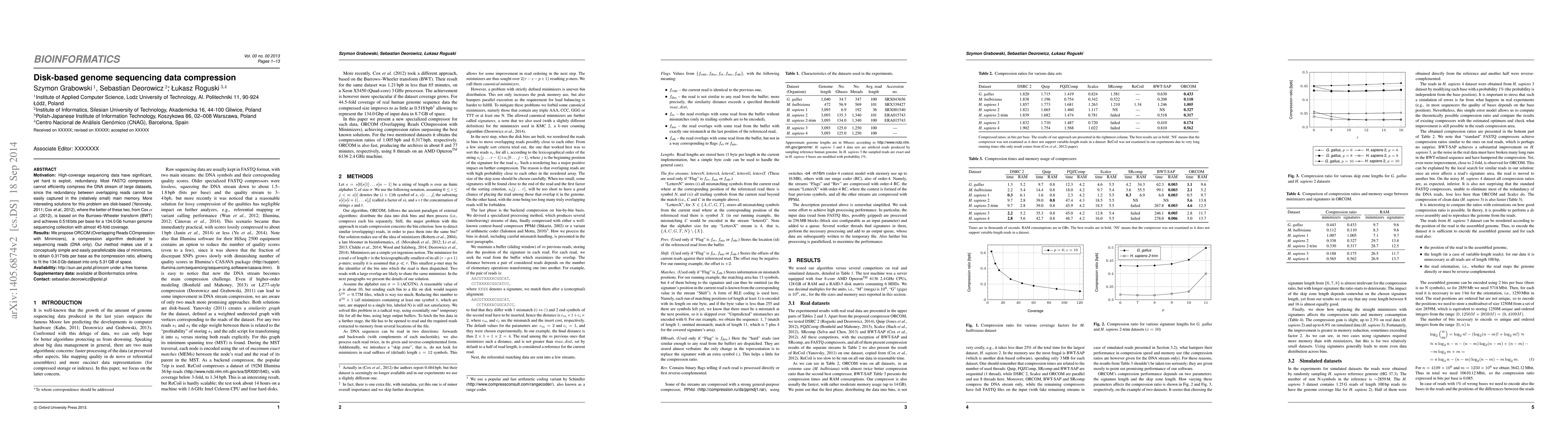 This paper proposes ORCOM, a disk-based compression algorithm for high-coverage genome sequencing data, achieving 0.317 bits per base and reducing a 134.0 Gb dataset to 5.31 GB. ORCOM leverages minimizers for efficient compression, outperforming existing methods.