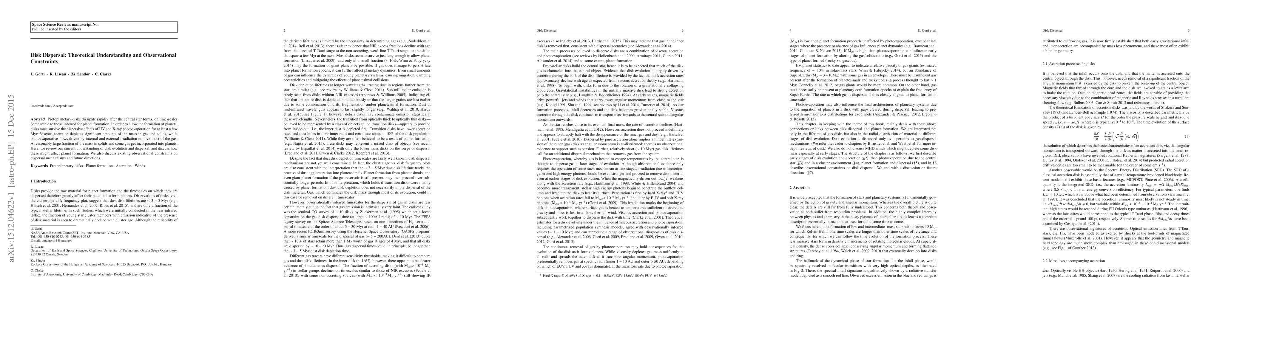 Protoplanetary disks dissipate rapidly after the central star forms, on time-scales comparable to those inferred for planet formation. In order to allow the formation of planets, disks must survive the dispersive effects of UV and X-ray photoevaporation for at least a few Myr. Viscous accretion depletes significant amounts of the mass in gas and solids, while photoevaporative flows driven by internal and external irradiation remove most of the gas. A reasonably large fraction of the mass in solids and some gas get incorporated into planets. Here, we review our current understanding of disk evolution and dispersal, and discuss how these might affect planet formation. We also discuss existing observational constraints on dispersal mechanisms and future directions.