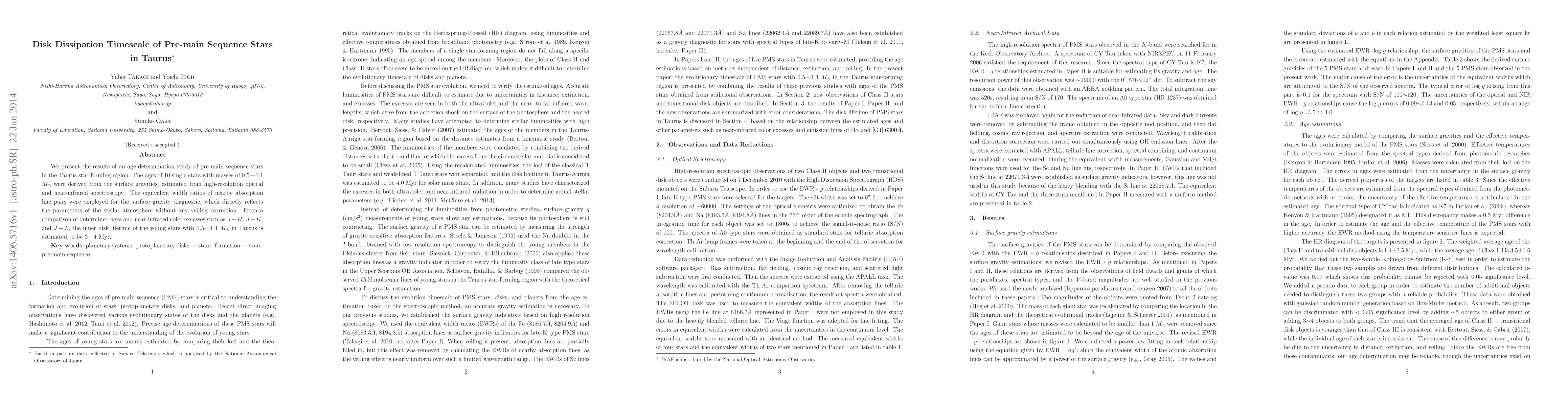 This study determines the ages of 10 pre-main sequence stars in Taurus, finding that the inner disk dissipation timescale for stars with masses 0.5-1.1 Msun is approximately 3-4 Myr. The ages were derived from surface gravities estimated via high-resolution spectroscopy and absorption line ratios.