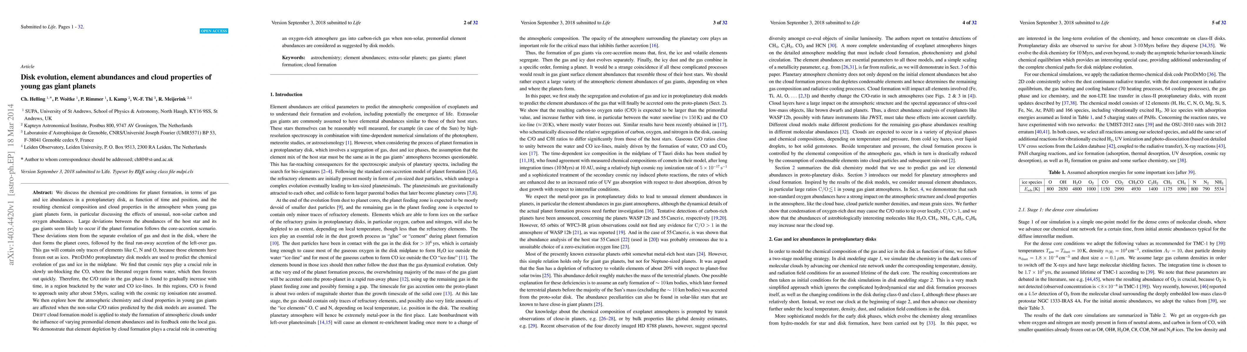 We discuss the chemical pre-conditions for planet formation, in terms of gas and ice abundances in a protoplanetary disk, as function of time and position, and the resulting chemical composition and cloud properties in the atmosphere when young gas giant planets form. Large deviations between the abundances of the host star and its gas giants seem likely to occur if the planet formation follows the core-accretion scenario. These deviations stem from the separate evolution of gas and dust in the disk, where the dust forms the planet cores, followed by the final run-away accretion of the left-over gas. ProDiMo protoplanetary disk models are used to predict the chemical evolution of gas and ice in the midplane. We find that cosmic rays play a crucial role in slowly un-blocking the CO, where the liberated oxygen forms water, which then freezes out quickly. Therefore, the C/O ratio in the gas phase is found to gradually increase with time, in a region bracketed by the water and CO ice-lines. In this regions, C/O is found to approach unity after about 5 Myrs, scaling with the cosmic ray ionisation rate. We then explore how the atmospheric chemistry and cloud properties in young gas giants are affected when the non-solar C/O ratios predicted by the disk models are assumed. The DRIFT cloud formation model is applied to study the formation of atmospheric clouds under the influence of varying primordial element abundances and its feedback onto the local gas. We demonstrate that element depletion by cloud formation plays a crucial role in converting an oxygen-rich atmosphere gas into carbon-rich gas when non-solar, primordial element abundances are considered as suggested by disk model.