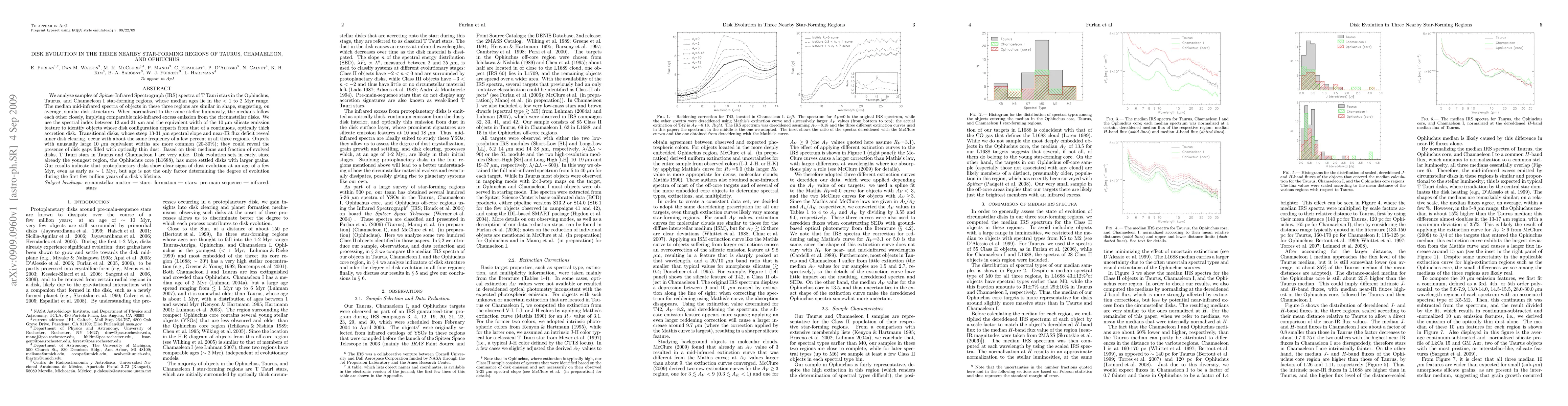This study examines Spitzer IRS spectra of T Tauri stars in Taurus, Chamaeleon, and Ophiuchus, finding similar disk structures and mid-infrared excess emissions across regions. Transitional disks indicate early inner disk clearing, while disks with large silicate features suggest gaps filled with optically thin dust. Disk evolution begins early, suggesting factors beyond age influence disk development.