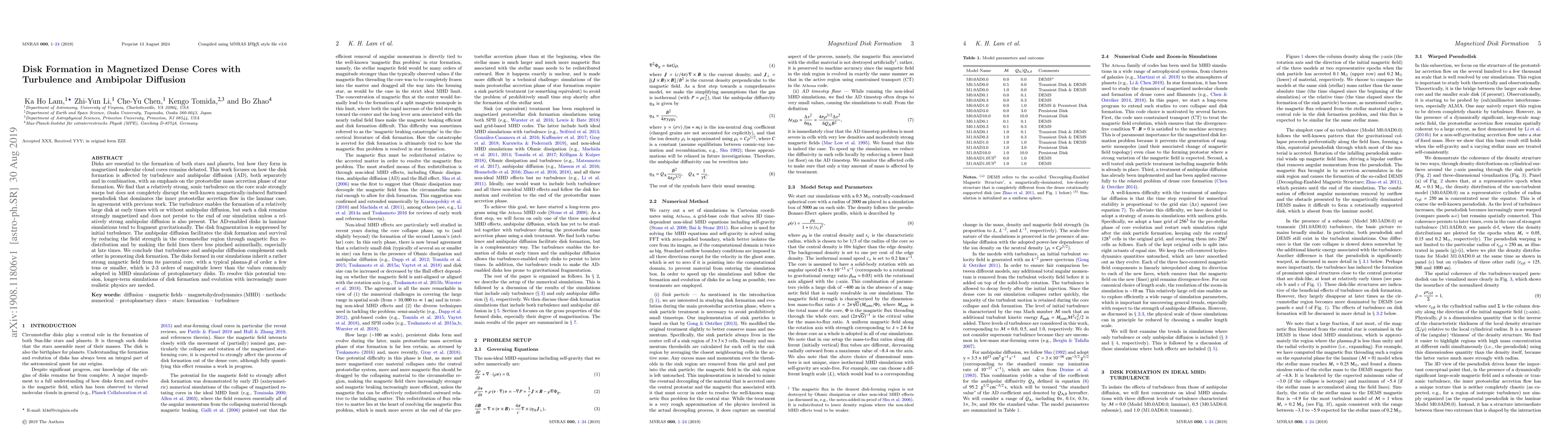 This paper investigates disk formation in magnetized dense cores under the influence of turbulence and ambipolar diffusion, finding that turbulence promotes early disk formation while ambipolar diffusion is crucial for sustaining it. The study highlights that turbulence and ambipolar diffusion complement each other in facilitating disk formation and survival, though the resulting disks retain strong magnetic fields.