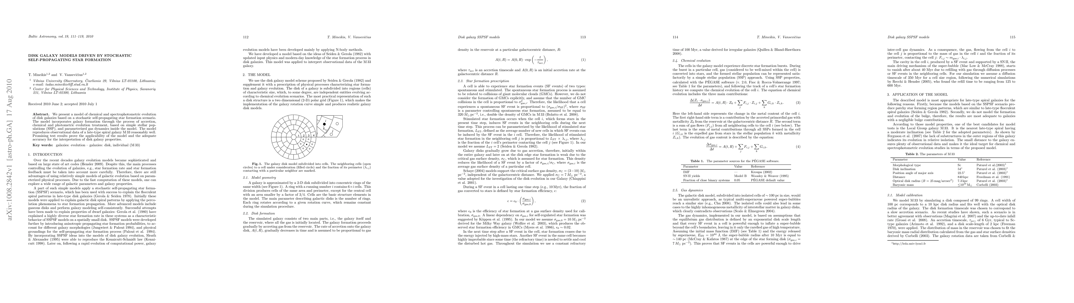 We present a model of chemical and spectrophotometric evolution of disk galaxies based on a stochastic self-propagating star formation scenario. The model incorporates galaxy formation through the process of accretion, chemical and photometric evolution treatment, based on simple stellar populations (SSP), and parameterized gas dynamics inside the model. The model reproduces observational data of a late-type spiral galaxy M33 reasonably well. Promising test results prove the applicability of the model and the adequate accuracy for the interpretation of disk galaxy properties.