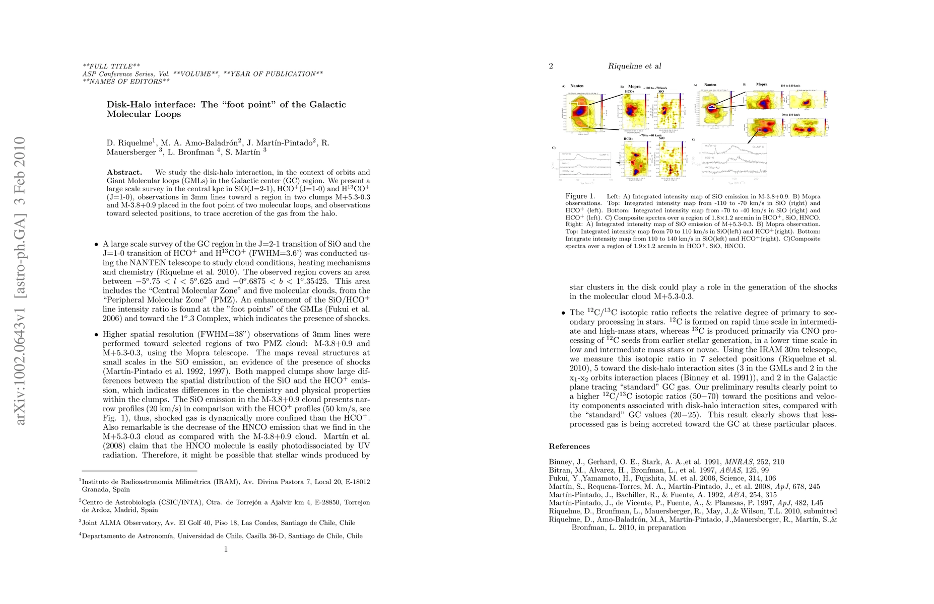 We study the disk-halo interaction, in the context of orbits and Giant Molecular loops (GMLs) in the Galactic center (GC) region. We present a large scale survey in the central kpc in SiO(J=2-1), HCO$^+$(J=1-0) and H$^{13}$CO$^+$ (J=1-0), observations in 3mm lines toward a region in two clumps M+5.3-0.3 and M-3.8+0.9 placed in the foot point of two molecular loops, and observations toward selected positions, to trace accretion of the gas from the halo