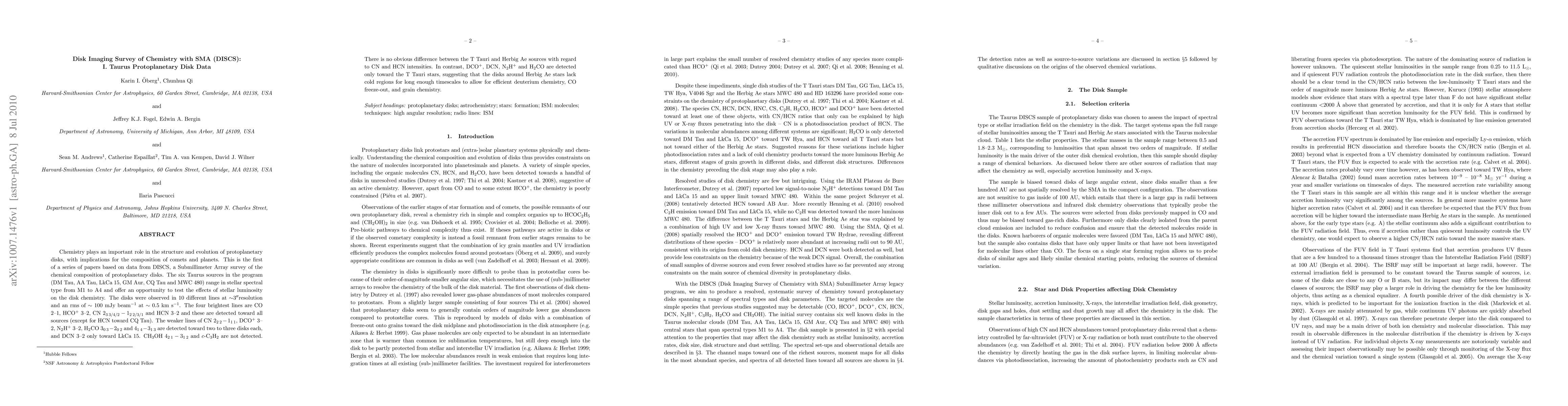 Chemistry plays an important role in the structure and evolution of protoplanetary disks, with implications for the composition of comets and planets. This is the first of a series of papers based on data from DISCS, a Submillimeter Array survey of the chemical composition of protoplanetary disks. The six Taurus sources in the program (DM Tau, AA Tau, LkCa 15, GM Aur, CQ Tau and MWC 480) range in stellar spectral type from M1 to A4 and offer an opportunity to test the effects of stellar luminosity on the disk chemistry. The disks were observed in 10 different lines at ~3" resolution and an rms of ~100 mJy beam-1 at ~0.5 km s-1. The four brightest lines are CO 2-1, HCO+ 3-2, CN 2_3-1_2 and HCN 3-2 and these are detected toward all sources (except for HCN toward CQ Tau). The weaker lines of CN 2_2-1_1, DCO+ 3-2, N2H+ 3-2, H2CO 3_03-2_02 and 4_14-3_13 are detected toward two to three disks each, and DCN 3-2 only toward LkCa 15. CH3OH 4_21-3_12 and c-C3H2 are not detected. There is no obvious difference between the T Tauri and Herbig Ae sources with regard to CN and HCN intensities. In contrast, DCO+, DCN, N2H+ and H2CO are detected only toward the T Tauri stars, suggesting that the disks around Herbig Ae stars lack cold regions for long enough timescales to allow for efficient deuterium chemistry, CO freeze-out, and grain chemistry.