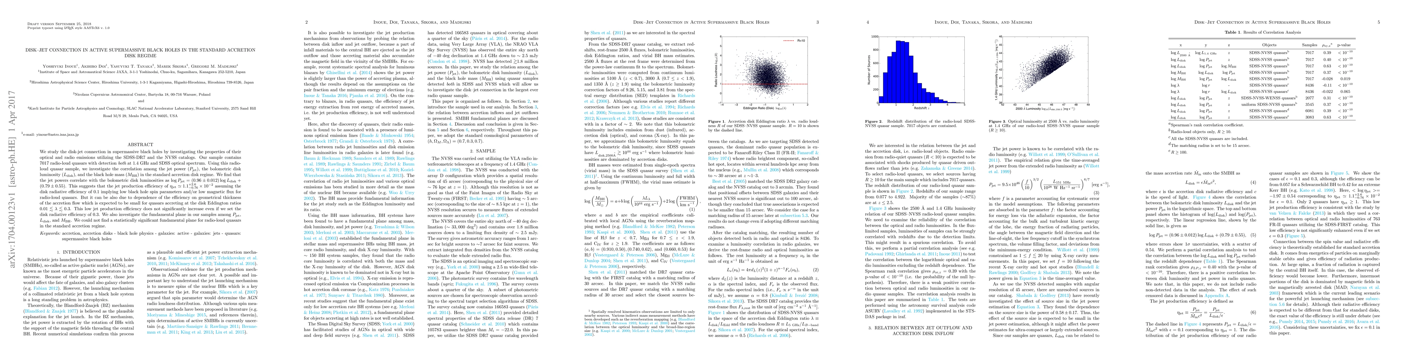 We study the disk-jet connection in supermassive black holes by investigating the properties of their optical and radio emissions utilizing the SDSS-DR7 and the NVSS catalogs. Our sample contains 7017 radio-loud quasars with detection both at 1.4~GHz and SDSS optical spectrum. Using this radio-loud quasar sample, we investigate the correlation among the jet power ($P_{\rm jet}$), the bolometric disk luminosity ($L_{\rm disk}$), and the black hole mass ($M_{\rm BH}$) in the standard accretion disk regime. We find that the jet powers correlate with the bolometric disk luminosities as $\log P_{\rm jet} = (0.96\pm0.012)\log L_{\rm disk} + (0.79 \pm 0.55)$. This suggests that the jet production efficiency of $\eta_{\rm jet}\simeq1.1_{-0.76}^{+2.6}\times10^{-2}$ assuming the disk radiative efficiency of $0.1$ implying low black hole spin parameters and/or low magnetic flux for radio-loud quasars. But it can be also due to dependence of the efficiency on geometrical thickness of the accretion flow which is expected to be small for quasars accreting at the disk Eddington ratios $0.01 \lesssim \lambda \lesssim 0.3$. This low jet production efficiency does not significantly increase even if we set the disk radiative efficiency of 0.3. We also investigate the fundamental plane in our samples among $P_{\rm jet}$, $L_{\rm disk}$, and $M_{\rm BH}$. We could not find a statistically significant fundamental plane for radio-loud quasars in the standard accretion regime.