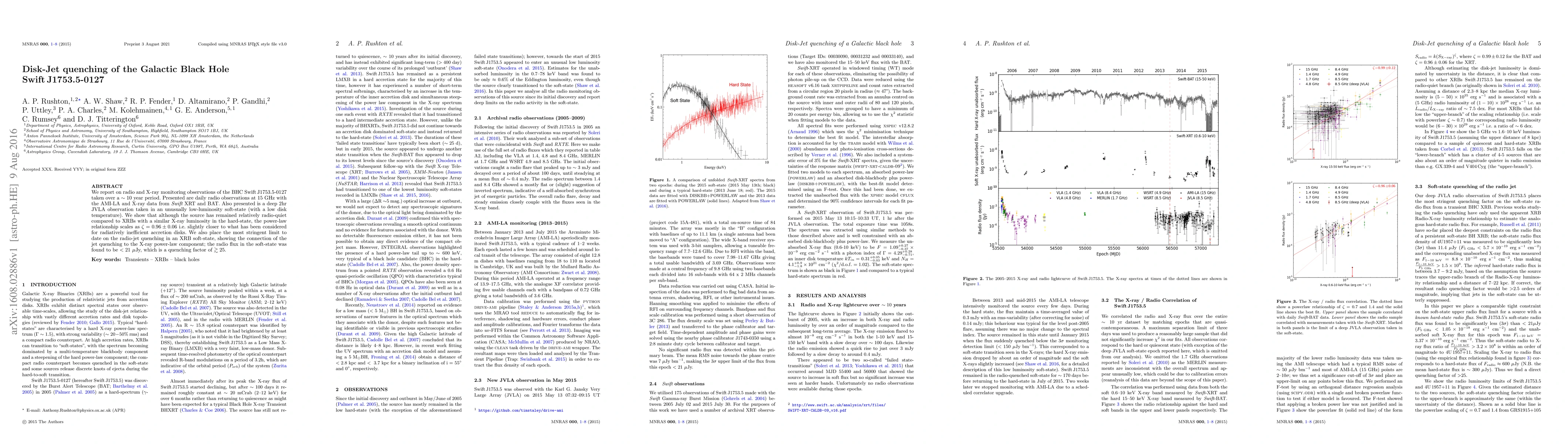 We report on radio and X-ray monitoring observations of the BHC Swift J1753.5-0127 taken over a ~10 year period. Presented are daily radio observations at 15 GHz with the AMI-LA and X-ray data from Swift XRT and BAT. Also presented is a deep 2hr JVLA observation taken in an unusually low-luminosity soft-state (with a low disk temperature). We show that although the source has remained relatively radio-quiet compared to XRBs with a similar X-ray luminosity in the hard-state, the power-law relationship scales as $\zeta=0.96\pm0.06$ i.e. slightly closer to what has been considered for radiatively inefficient accretion disks. We also place the most stringent limit to date on the radio-jet quenching in an XRB soft-state, showing the connection of the jet quenching to the X-ray power-law component; the radio flux in the soft-state was found to be $<21~\mu$Jy, which is a quenching factor of $\gtrsim25$