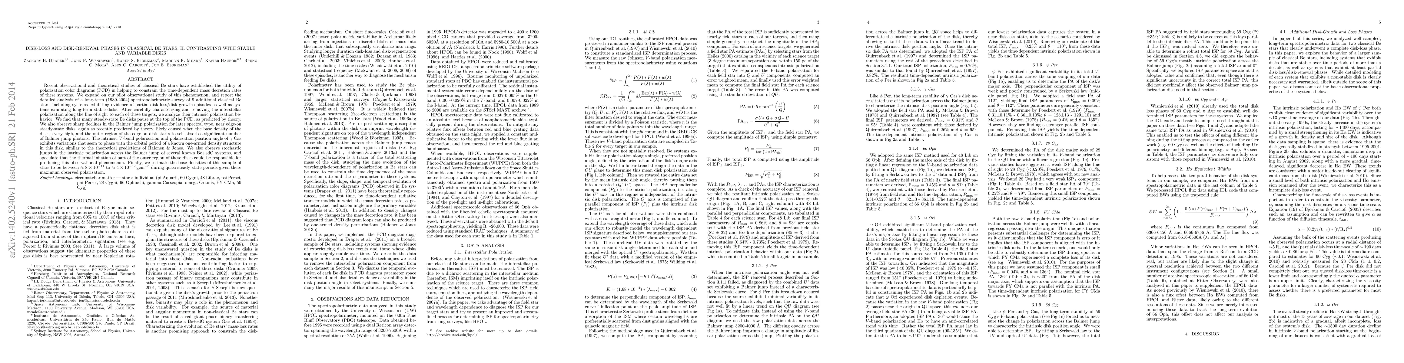 This paper investigates the disk-loss and disk-renewal phases in classical Be stars using a long-term spectropolarimetric survey, finding that many steady-state Be disks exhibit predicted behavior in polarization color diagrams. The study also observes variations in polarization linked to orbital periods and density structures, suggesting complex disk dynamics.