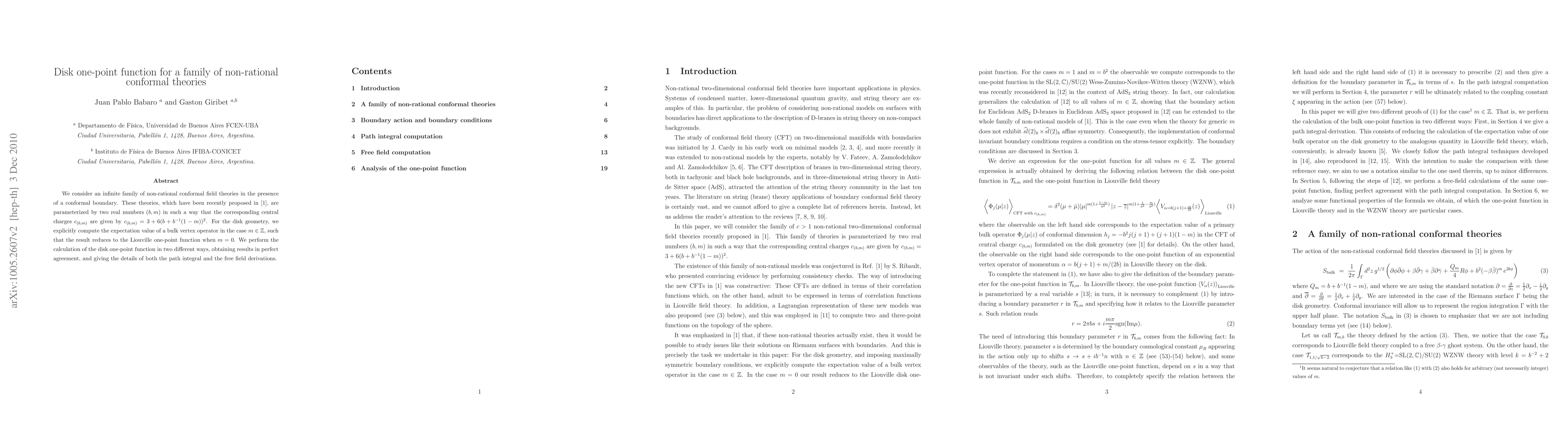 This paper computes the disk one-point function for a family of non-rational conformal field theories parameterized by (b,m), obtaining results that agree through both path integral and free field derivations, with a special case reducing to the Liouville one-point function when m=0.