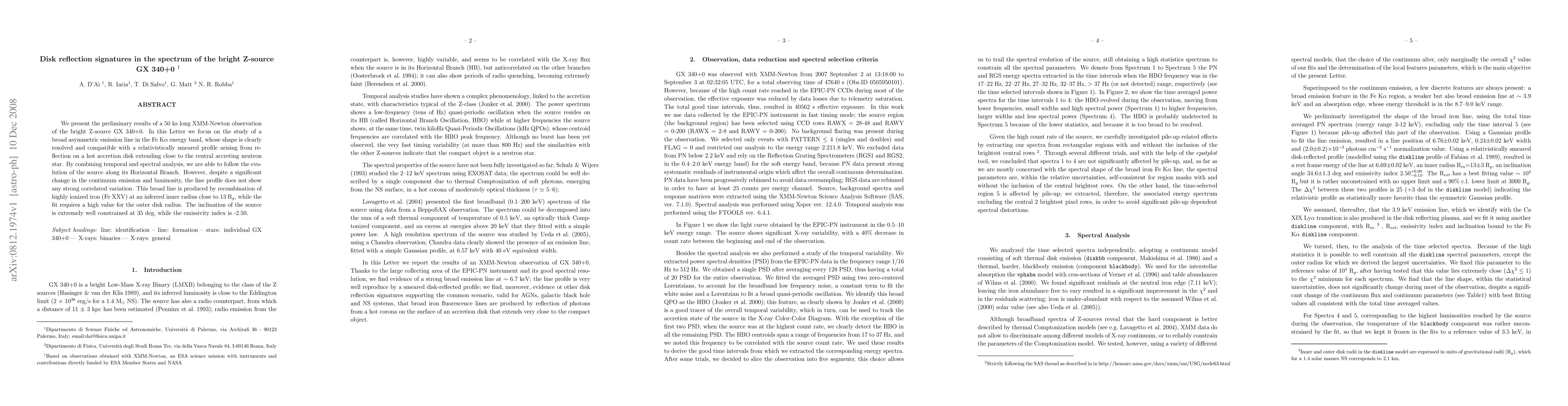 We present the preliminary results of a 50 ks long XMM-Newton observation of the bright Z-source GX 340+0. In this Letter we focus on the study of a broad asymmetric emission line in the Fe K alpha energy band, whose shape is clearly resolved and compatible with a relativistically smeared profile arising from reflection on a hot accretion disk extending close to the central accreting neutron star. By combining temporal and spectral analysis, we are able to follow the evolution of the source along its Horizontal Branch. However, despite a significant change in the continuum emission and luminosity, the line profile does not show any strong correlated variation. This broad line is produced by recombination of highly ionized iron (Fe XXV) at an inferred inner radius close to 13 gravitational radii while the fit requires a high value for the outer disk radius. The inclination of the source is extremely well constrained at 35 deg, while the emissivity index is -2.50.