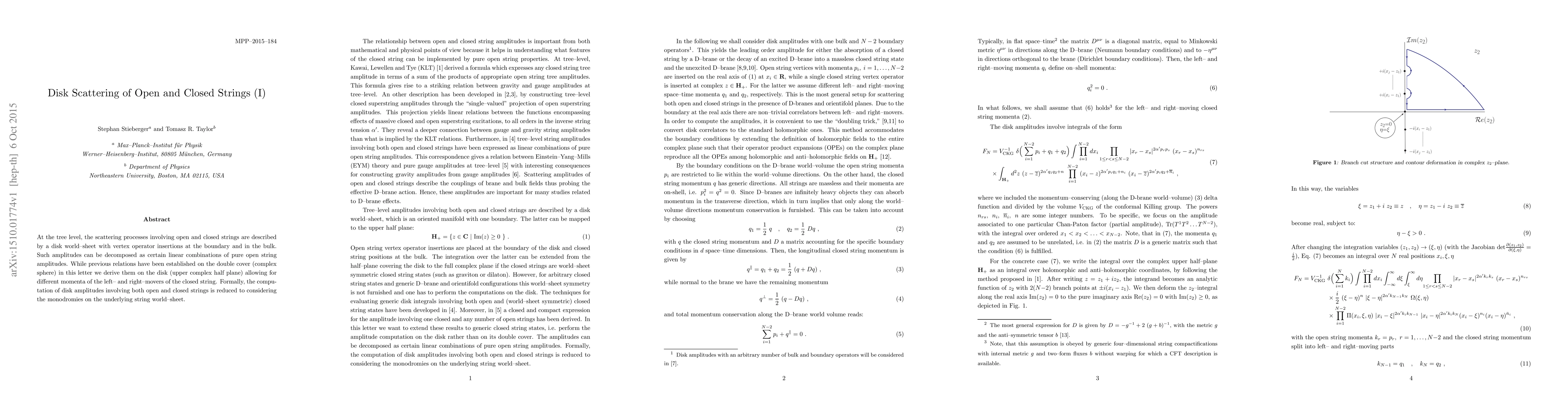 Summary: This paper explores tree-level scattering processes involving open and closed strings using disk world-sheets, deriving relations on the upper complex half-plane that accommodate distinct momenta for left- and right-movers, and reduces the computation to monodromies on the string world-sheet. The results generalize previous findings on the double cover.