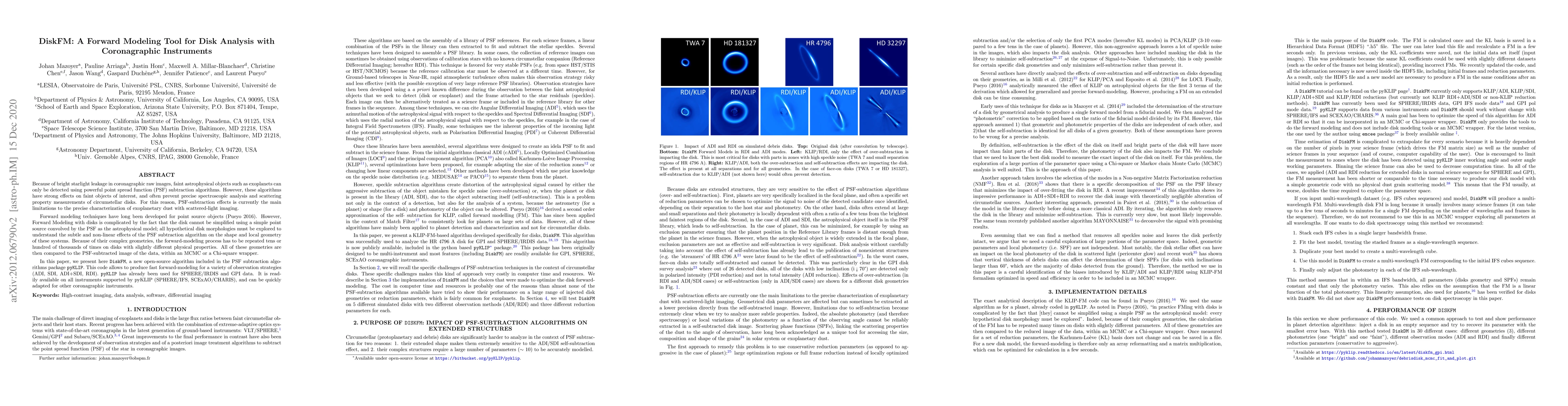 Because of bright starlight leakage in coronagraphic raw images, faint astrophysical objects such as exoplanets can only be detected using powerful point spread function (PSF) subtraction algorithms. However, these algorithms have strong effects on faint objects of interest, and often prevent precise spectroscopic analysis and scattering property measurements of circumstellar disks. For this reason, PSF-subtraction effects is currently the main limitations to the precise characterization of exoplanetary dust with scattered-light imaging. Forward-modeling techniques have long been developed for point source objects. However, forward-modeling with disks is complicated by the fact that the disk cannot be simplified using a simple point source convolved by the PSF as the astrophysical model; all hypothetical disk morphologies must be explored to understand the subtle and non-linear effects of the PSF subtraction algorithm on the shape and local geometry of these systems. Because of their complex geometries, the forward-modeling process has to be repeated tens or hundred of thousands of times on disks with slightly different physical properties. All of these geometries are then compared to the PSF-subtracted image of the data, within an MCMC or a Chi-square wrapper. In this paper, we present here DiskFM, a new open-source algorithm included in the PSF subtraction algorithms package pyKLIP. This code allows to produce fast forward-modeling for a variety of observation strategies (ADI, SDI, ADI+SDI, RDI). pyKLIP has already been used for SPHERE/IRDIS and GPI data. It is readily available on all instruments supported by pyKLIP (SPHERE/IFS, SCExAO/CHARIS), and can be quickly adapted for other coronagraphic instruments.