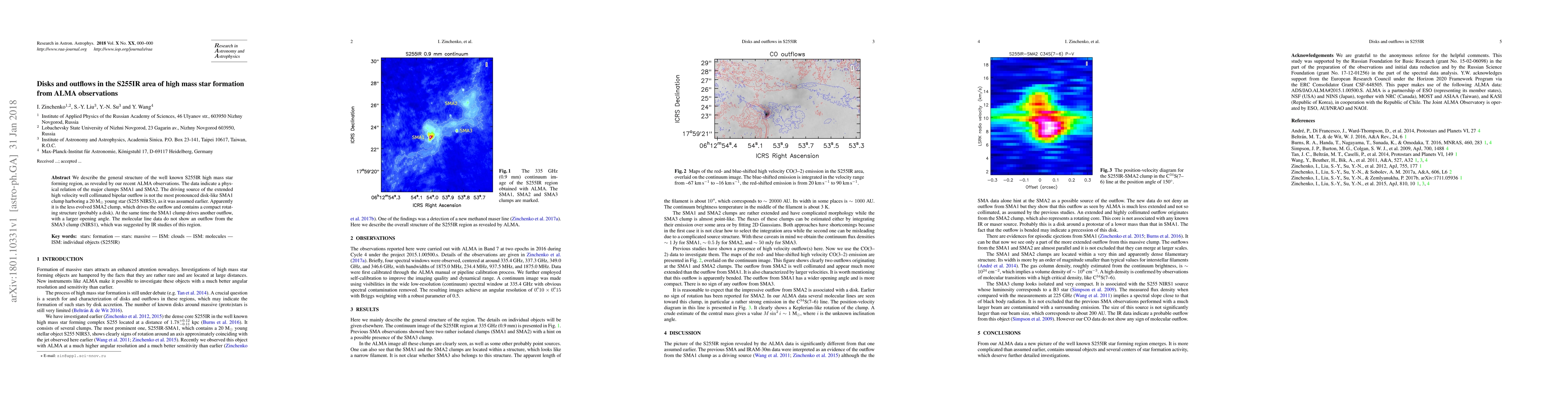 We describe the general structure of the well known S255IR high mass star forming region, as revealed by our recent ALMA observations. The data indicate a physical relation of the major clumps SMA1 and SMA2. The driving source of the extended high velocity well collimated bipolar outflow is not the most pronounced disk-like SMA1 clump harboring a 20 M$_\odot$ young star (S255 NIRS3), as it was assumed earlier. Apparently it is the less evolved SMA2 clump, which drives the outflow and contains a compact rotating structure (probably a disk). At the same time the SMA1 clump drives another outflow, with a larger opening angle. The molecular line data do not show an outflow from the SMA3 clump (NIRS1), which was suggested by IR studies of this region.
