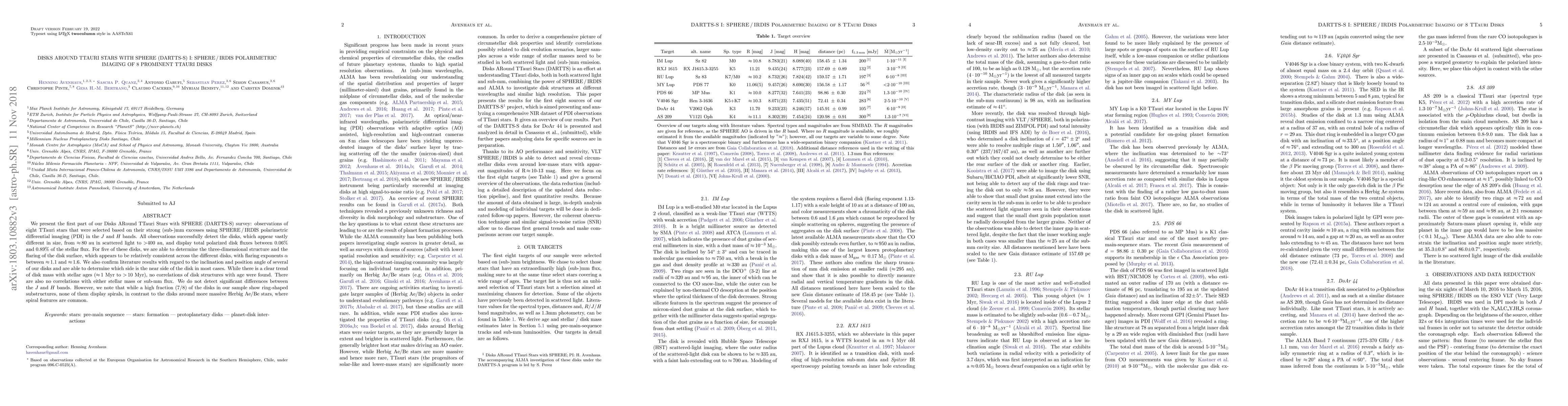 We present the first part of our DARTTS-S (Disks ARound TTauri Stars with SPHERE) survey: Observations of 8 TTauri stars which were selected based on their strong (sub-)mm excesses using SPHERE / IRDIS polarimetric differential imaging (PDI) in the J and H bands. All observations successfully detect the disks, which appear vastly different in size, from $\approx$80 au in scattered light to $>$400 au, and display total polarized disk fluxes between 0.06% and 0.89% of the stellar flux. For five of these disks, we are able to determine the three-dimensional structure and the flaring of the disk surface, which appears to be relatively consistent across the different disks, with flaring exponents $\alpha$ between $\approx$1.1 and $\approx$1.6. We also confirm literature results w.r.t. the inclination and position angle of several of our disk, and are able to determine which side is the near side of the disk in most cases. While there is a clear trend of disk mass with stellar ages ($\approx$1 Myr to $>$10 Myr), no correlations of disk structures with age were found. There are also no correlations with either stellar mass or sub-mm flux. We do not detect significant differences between the J and H bands. However, we note that while a high fraction (7/8) of the disks in our sample show ring-shaped sub-structures, none of them display spirals, in contrast to the disks around more massive Herbig Ae/Be stars, where spiral features are common.