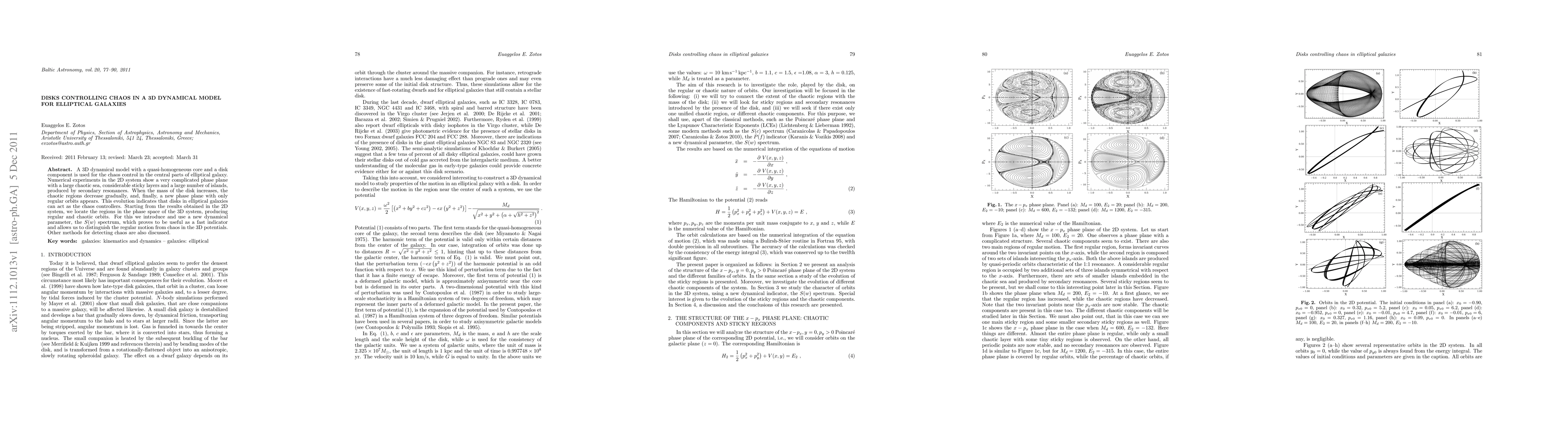 This paper explores how a 3D dynamical model with a disk component can control chaos in the central regions of elliptical galaxies. Increasing the disk mass reduces chaotic regions, indicating that disks may act as chaos controllers, and introduces a new parameter, the S(w) spectrum, to distinguish regular from chaotic motion.
