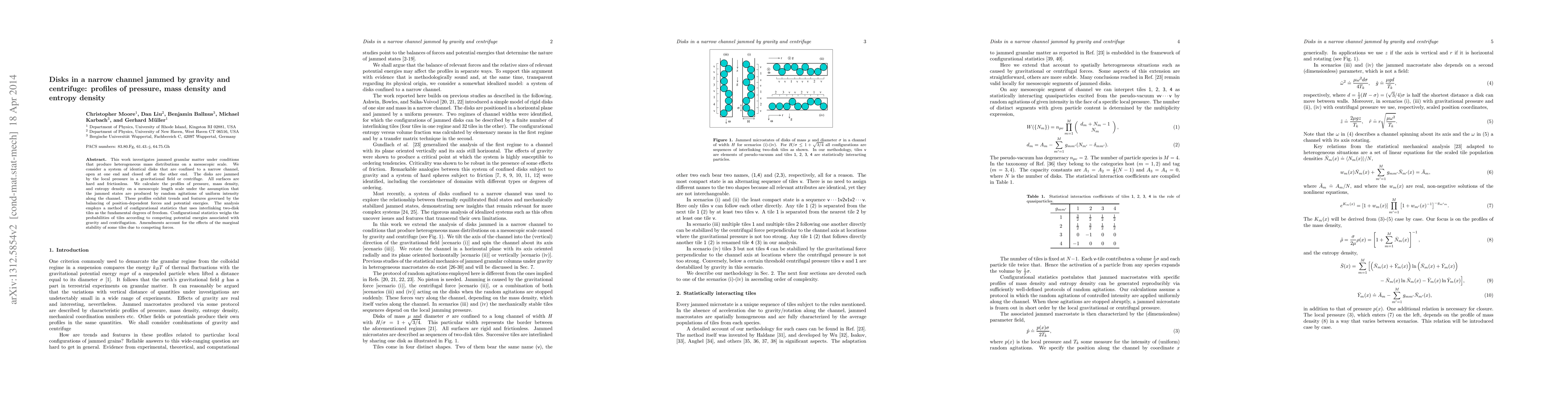 Researchers studied jammed disks in a narrow channel under gravitational and centrifugal forces, finding profiles of pressure, mass density, and entropy density that reveal the balancing of competing forces.