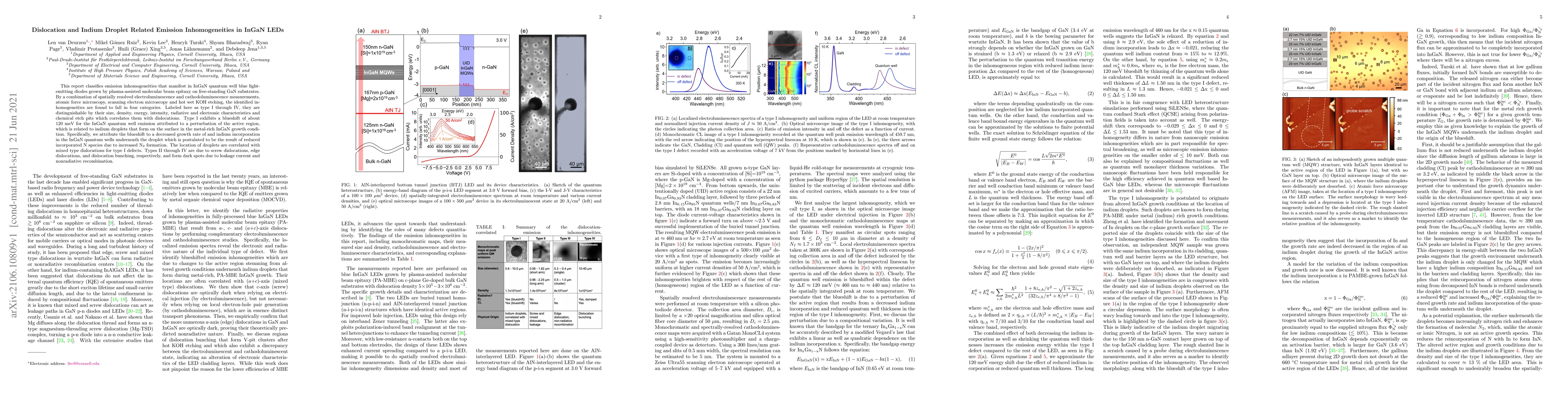 This study categorizes emission inhomogeneities in InGaN LEDs into four types (I-IV) based on their characteristics and correlation with dislocations. Type I is linked to indium droplets causing a blueshift due to reduced nitrogen incorporation, while types II-IV are associated with screw, edge dislocations, and dislocation bunches causing dark spots from leakage current and nonradiative recombination.