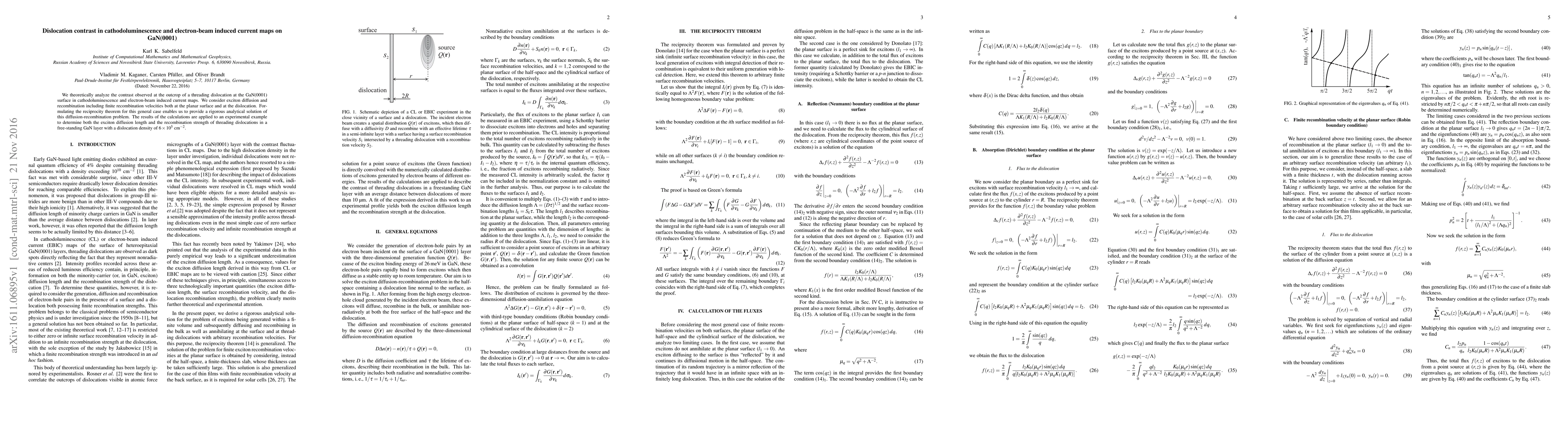 This paper theoretically analyzes the contrast seen at dislocations in GaN(0001) using cathodoluminescence and electron-beam induced current maps, providing an analytical solution for exciton diffusion and recombination. The study determines the exciton diffusion length and recombination strength of threading dislocations in a GaN layer with a dislocation density of $6\times10^{5}$~cm$^{-2}$.