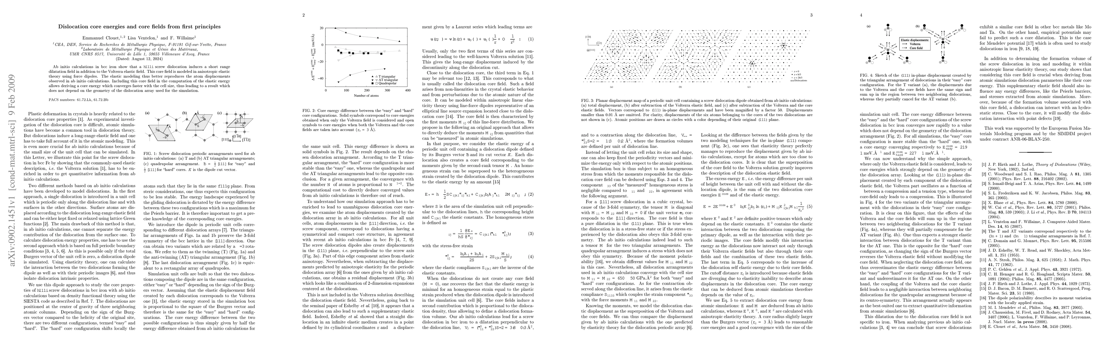The paper introduces an anisotropic elastic theory modeling dislocation core fields using force dipoles, which better reproduces atom displacements from ab initio calculations, leading to a converging dislocation core energy independent of dislocation array geometry.