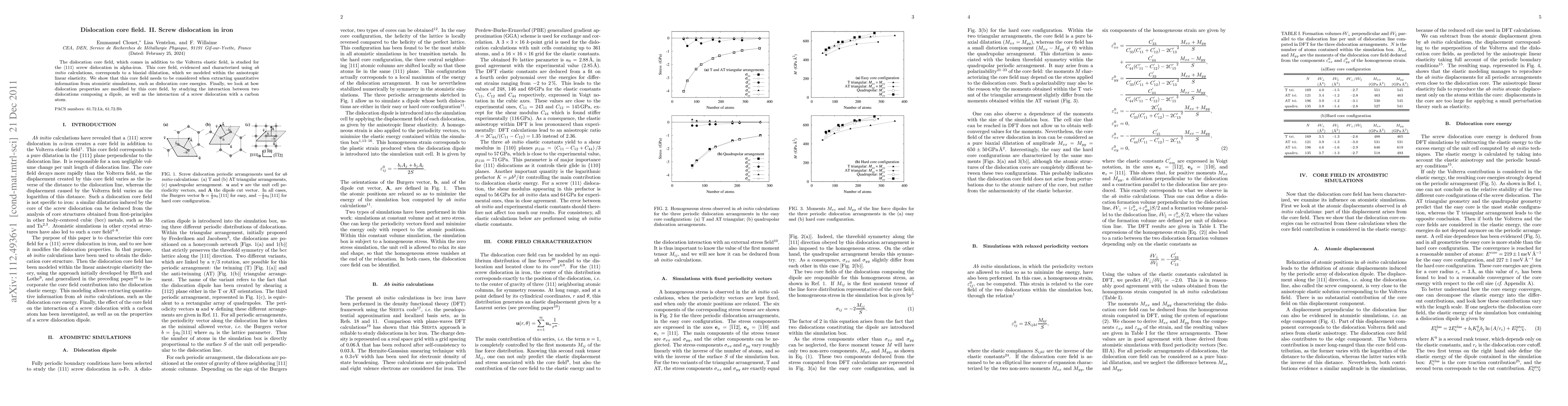 This paper investigates the dislocation core field for a <111> screw dislocation in alpha-iron, revealing a biaxial dilatation modeled via anisotropic linear elasticity. It emphasizes the necessity of considering this core field in atomistic simulations for accurate dislocation core energy measurements and examines its impact on dislocation interactions.