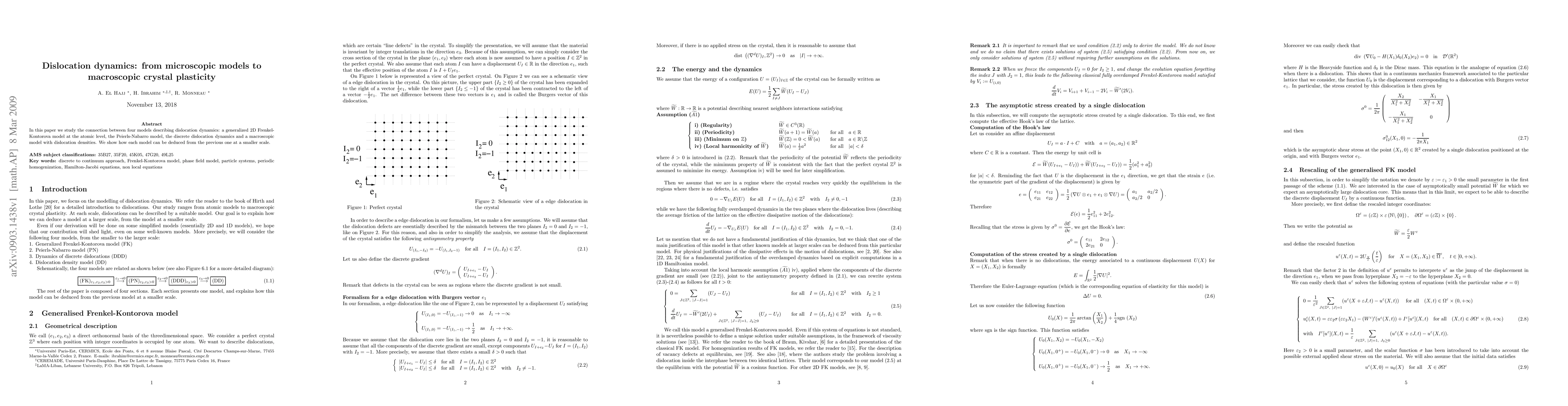 In this paper we study the connection between four models describing dislocation dynamics: a generalized 2D Frenkel-Kontorova model at the atomic level, the Peierls-Nabarro model, the discrete dislocation dynamics and a macroscopic model with dislocation densities. We show how each model can be deduced from the previous one at a smaller scale.