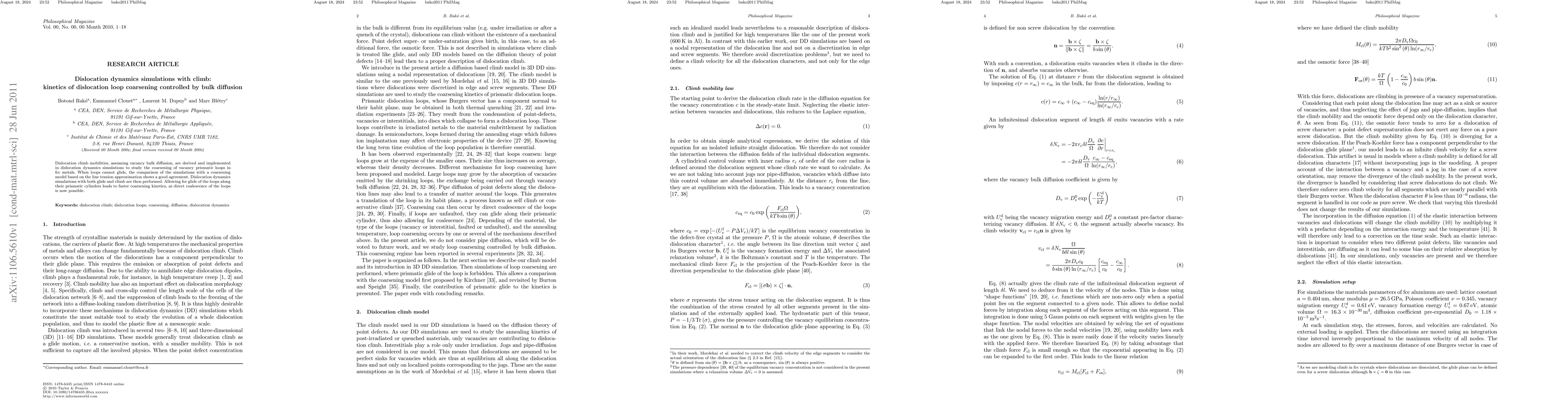 Summary: This paper derives dislocation climb mobilities for vacancy bulk diffusion and uses them in simulations to study the coarsening of prismatic loops in fcc metals. Simulations show good agreement with a model based on line tension when loops cannot glide, but allow glide for faster coarsening kinetics due to direct loop coalescence.